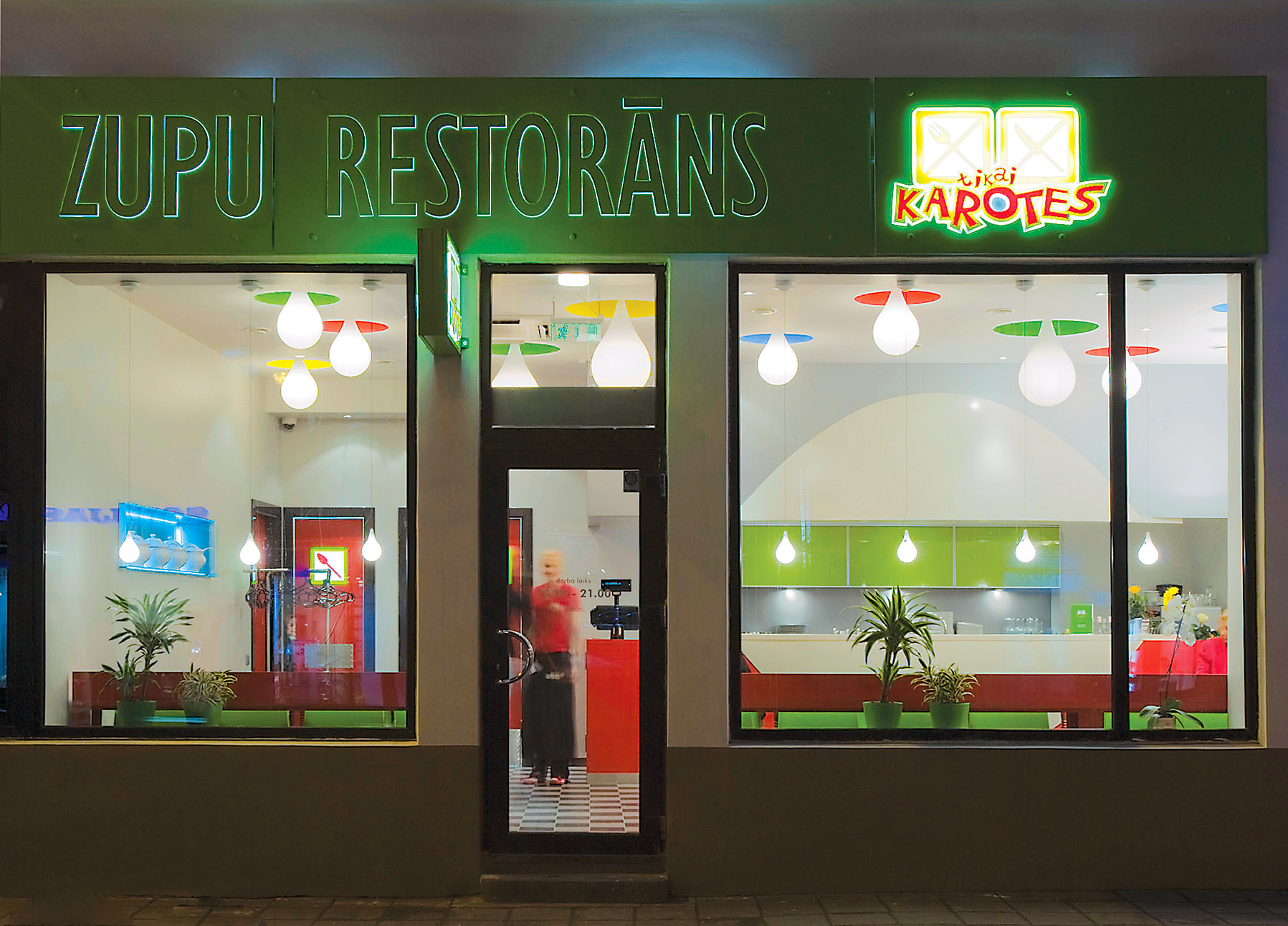 «Karotēs» krāsu nav daudz, toties tās ir tīras: esot nākušas no dzīvespriecīgā biroja logo. Interjera autore dabūjusi rokās tik jaudīgus instrumentus kā pretkrāsas - zaļu un sarkanu -, ar kurām nemākulis var savainoties. Turklāt bijusi drosmīga, lai sīkākās detaļās vēl piepulcētu cīnītājus no krāsu skalas pamatsastāva - zilo un dzelteno. Krāsas ir dozētas, atšķaidot ar melno un balto, un forma ir gandrīz tikpat tīra kā krāsas. Visi iekštelpas elementi saslēdzas viengabala mehānismā, kas no tiesas strādā: visas skrūves un zobrati ir vietās, sistēmai liekas rezerves daļas apkārt nemētājas. Mazītiņais un demokrātiskais Barona ielas ēstūzis latviešu sabiedrisko interjeru topā atzīmējams tālab, ka gadījums patiesībā ir rets - tik dekoratīvs un spilgts interjers uzdrošinās dzīvot laikā, kurā tas tapis, nekoķetē ar pagātni un nemēģina klientam iebarot pastāstus vai pasaciņas. Ēdiet zupu!