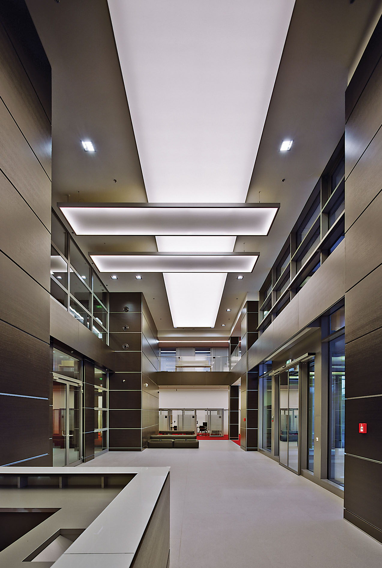Visi četri korpusi pārsedz apakšā palikušo garāžas apjomu. Šāda korpusu atdalīšana vienam no otra vienlaikus nodrošina gan objekta masas atbilstību vēsturiskajam mērogam, gan dabisko gaismu it visās darba telpās. Apakšējos stāvos biroji izvietoti pa perimetru ap noslēgto garāžas apjomu, bet augšējos logi atveras gan uz ārējo perimetru, gan arī uz trim iekšējiem pagalmiem. Garāžas apjomā daļēji izvietotas darbinieku automašīnas, daļēji to aizņem tehniskais stāvs un citas tehnoloģiskās telpas, bet slīpais garāžas jumts ļāvis izveidot negaidīti izteiksmīgu konferenču zāli.