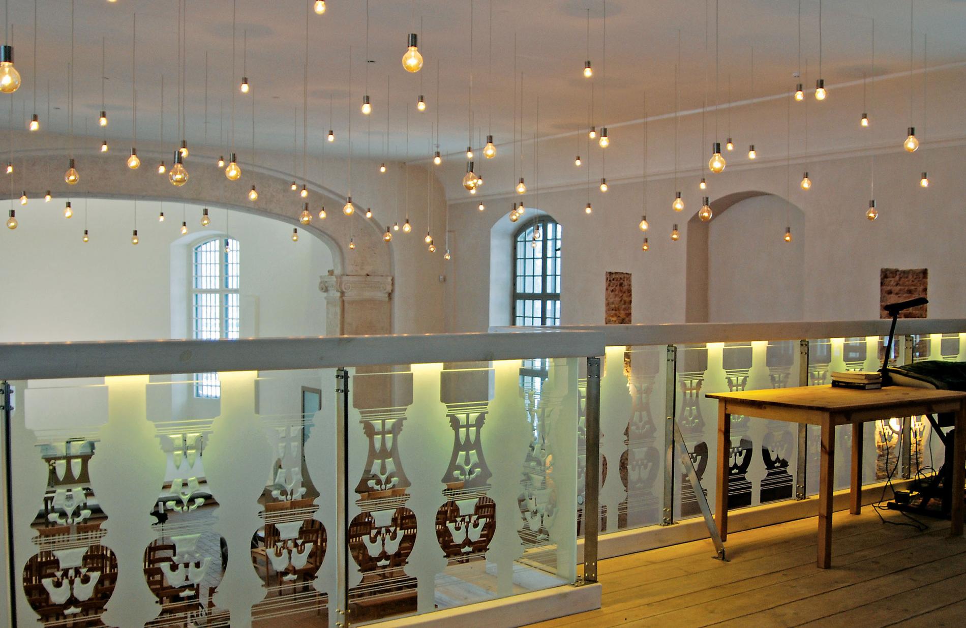 Koks un stikls radis ideālu saskaņu. Visām stikla detaļām izmantots baltais jeb optiskais stikls, kam nav tik liela dzelzs piejaukuma kā parastā stiklā - lai atstarotajā gaismā mēbeles būtu nevis zaļas, bet gan tīras - baltas kā no stikla. Mēbeļu silueta pamatā ir vienkāršība, kas stilistiski ir pretēja sākotnējam baroka iekārtojumam. Autore vēlējās rast kopsaucēju ar oriģinālo interjeru un atrada: uz stikla detaļām attēloja vēsturiskos ornamentus, kas kādreiz rotāja baznīcas sienas kā krāsojumu joslas un koka norobežojumu elementus.