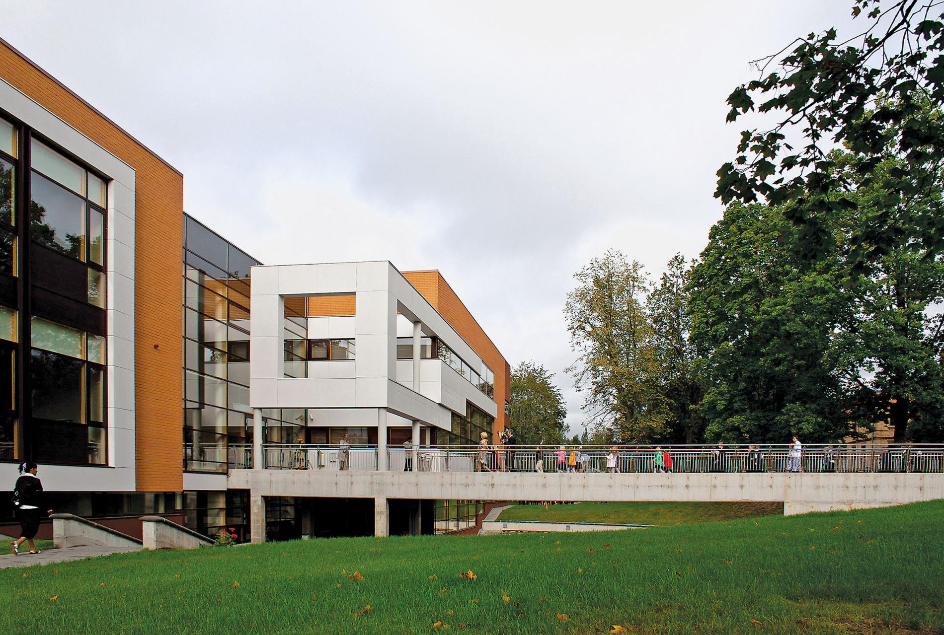 Tuvošanās skolai pa augšupejošu reljefu, kas nosedz skatu uz galveno fasādi, rada noslēpumu, toties ieiešana skolā ir kā svētki - uz galveno ieeju jau ved plašs betona tilts, zem kura, izmantojot novietnes reljefu, ir veidots iedziļinājums. Tilts uz zināšanām - tā šo arhitektonisko risinājumu raksturo arhitekte Andra Bula. Tas ir veidots tik vilinošs, ka rodas vēlme bez kavēšanās pārvarēt šo posmu un atvērt durvis. Par labi iestudētu performanci īpaši tas izvēršas 1. septembrī. Bērnu rinda raiti šķērso tiltu, ir puķes, prieks sejā un pat scenogrāfija - atspīdumi stiklotajā fasādē un baltais virs ieejas durvīm izveidotais karkass kuba formā, simbolizējot kārtību un stabilitāti, iedrošina sākt mācību ceļu. Nākotnē karkasā ir paredzēts ievietot lielu pulksteni, lai vienmēr būtu laika izjūta.
