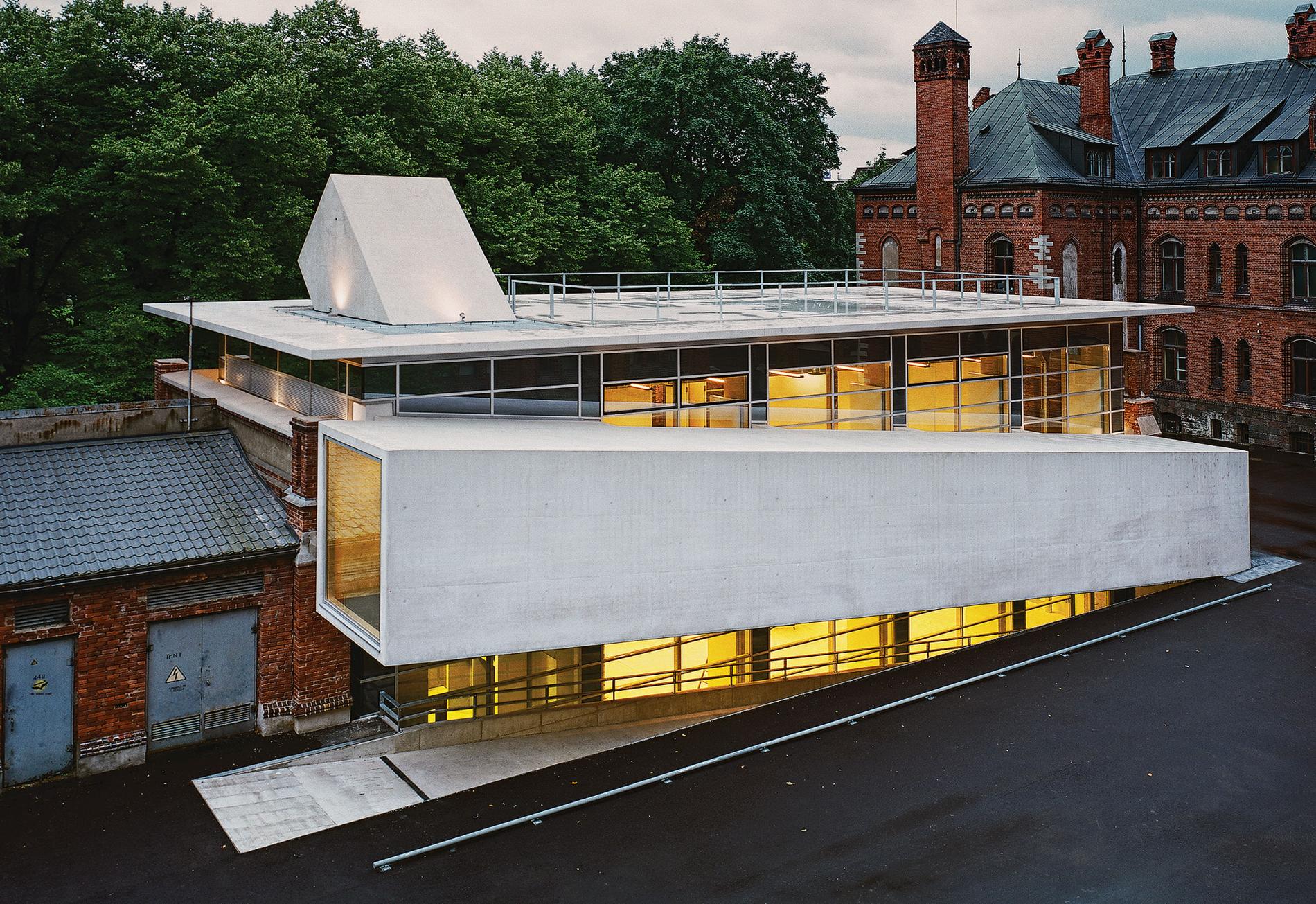Jaunais apjoms, ko veido ekonomiskas tipveida stikla konstrukcijas, iesēdināts vecā mūra čaulā, kas saglabāta pret parku. Papildu platības iegūtas, attīstot projektu vertikālā dimensijā. Respektējot skatu uz vēsturisko akadēmijas ēku no parka puses, ēkas korpuss trīs metrus iedziļināts zemē (apakšējā līmeņa palielināto griestu augstumu ietekmējušas tehniskās vajadzības, ko nosaka audiovizuālo mediju mākslas nodaļa, kura to šobrīd apdzīvo), izveidojot divus stāvus un lietojamu terasi. Vizuālās izmaiņas parka ainā, ko rīdzinieki varējuši vērot vairāk nekā sešdesmit gadus, no tiesas nav lielas. Jaunais, stiklotais apjoms novietots ar atrāvumu no vēsturiskā mūra - iegūtā telpa tiek izmantota rezerves izejai, vecajai sienai ļaujot uzņemties žalūzijas funkciju. Tā kā mūris ir bēdīgā tehniskajā stāvoklī (tam ir teju neesoši pamati), uzlabojumi ar jaunizveidotajām logailām vienmērīgai dienas gaismas piekļuvei mūra saglabāšanu ļauj uzskatīt par tīri ideoloģisku žestu. Rekonstrukcijas nosacījumi un budžeta spīles atgādina antīko varoņu kuģojumus starp Skillu un Haribdu, un, iespējams, projekta mākslinieciskās izteiksmes spēks dīdzis tieši līdzīgu manevru rezultātā. Pēc autoru aplēsēm, lifta, kam ar trim pieturām būtu jāapkalpo divi stāvi, un kāpņutelpu izveidošana bija racionāli nepamatota. Lai izpildītu vides pieejamības prasības, ieejas ēkā veido pandusi - neraugoties uz konstruktīvo sarežģītību, to izmaksas esot bijušas mazākas. Iznākumā monumentālais veidņotā betona panduss tagad kļuvis par kompozīcijas centrālo asi, arhitektoniskās domas vizuālo atslēgu (pēc ieceres - ar minimāliem kompozicionālajiem izteiksmes līdzekļiem materializēta arhitektoniska ideja, panduss kā tektoniska intriga, kas runā par masas un gravitācijas attiecībām), lai arī autors nosauc vēl vairākus projektā kodētus simboliskus elementus: jaunais apjoms pret veco kā paaudžu - studentu un pasniedzēju - dialogs, horizontālā jumta pārkare kontrastā ar vēsturiskās ēkas gotiskajām vertikālēm kā hierarhijas un kontekstuāla respekta apliecinājums, tajā skaitā pandusa gala logs, kas vērsts pret Nacionālo mākslas muzeju.