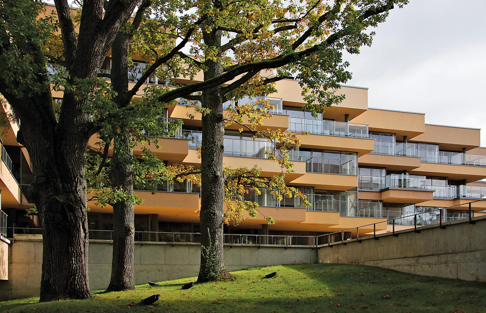 Teritorijā ēkas izvietotas tā, lai, ejot caur kompleksu, no dažādiem punktiem ikreiz pavērtos pilnīgi jauni rakursi, te atsedzot vai noslēpjot kādu no septiņiem namiem. Horizontālais fasāžu dalījums, masīvām dzelzsbetona fasādes joslām mijoties ar nepārtrauktām logu rindām, rada optisku ilūziju, ka ēkām četru stāvu vietā ir tikai divi. Gaisīgu efektu kompleksam piešķir arī citi arhitektoniski paņēmieni. Pirmo stāvu nesošās konstrukcijas ir veidotas kā brīvstāvoši dzelzsbetona balsti, bet stiklotās alumīnija konstrukcijas saules gaismai ļauj iekļūt visā stāva platībā.