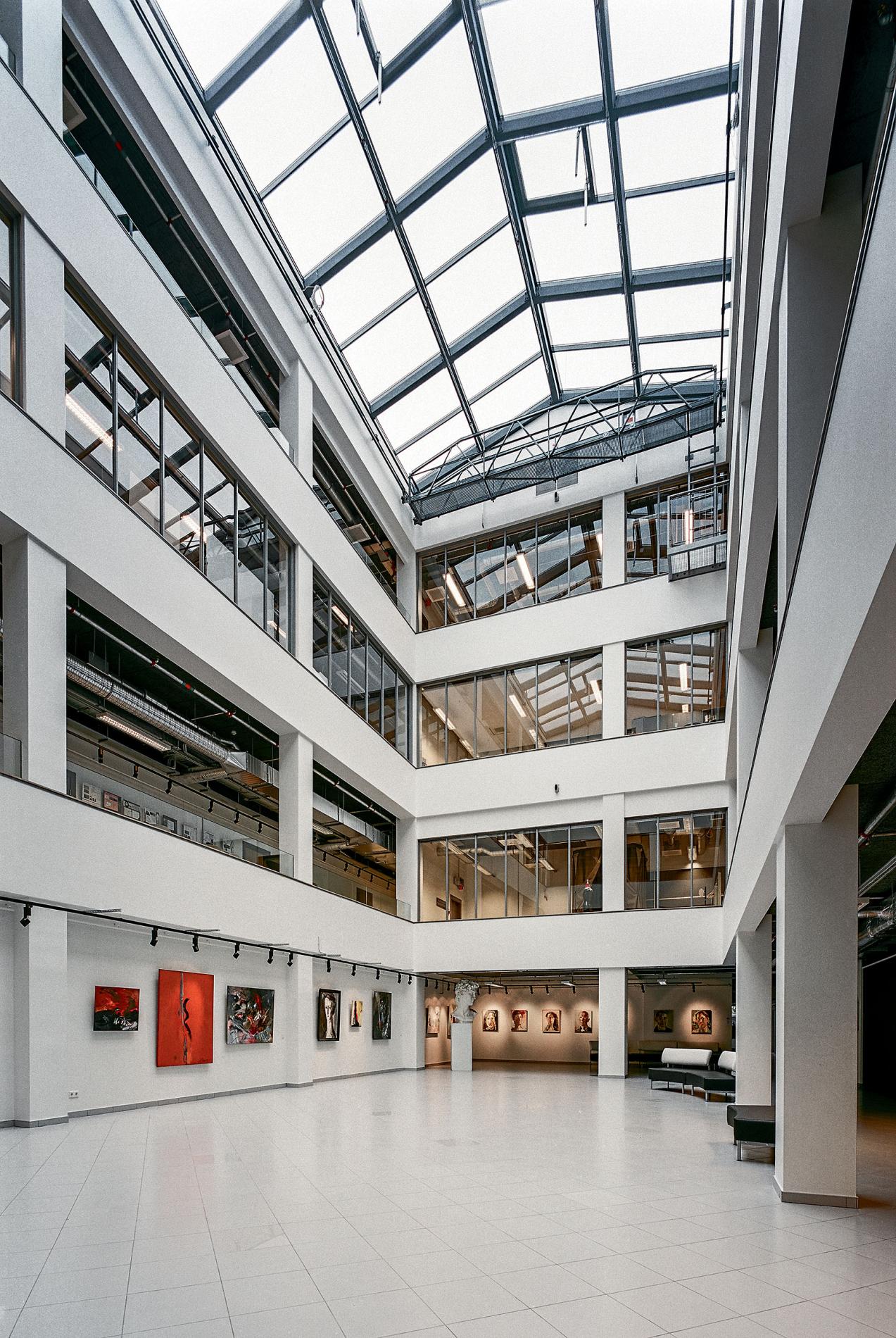 RTU Radošo industriju centra raksturīgākā pazīme ir jaunais un lielais ātrijs. Ēdnīcas ēka bija pārāk dziļa un gara, jo tā nebija paredzēta izglītības iestādei, tāpēc jau no paša sākuma bija skaidrs koncepts par segtas lieltelpas izveidi, kas nodrošinātu dabīgo apgaismojumu telpās un kļūtu par ēkas sirdi. Telpiskā ideja nemainījās, nesošais karkass un pamati tika izmantoti, bet kolonnas un to pamati pastiprināti. Kāpņu telpu izmēri neapmierināja evakuācijas prasības, tās tika demontētas, lai projektētu divas jaunas kāpņu telpas ēkas stūros.