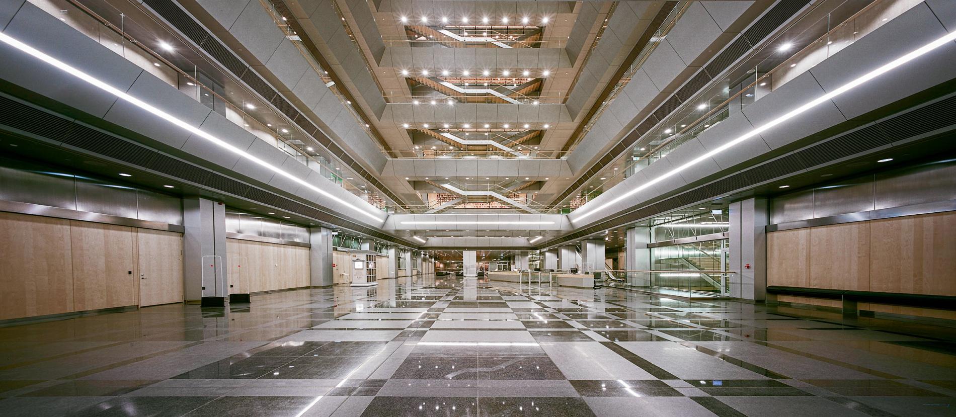 Navigācijas un grafisko zīmju sistēmas krāsu saspēle atbilst ēkas arhitektūras idejai un to attīsta atbilstoši «International Code Council ANSI» dokumentam «A117.1-1998». Viss sistēmas kopums sastāv no 17 dažādām zīmju grupām, kas ietver funkcionālas norādes, stāvu plānus ar jau tik pierasto sarkano punktu «Jūs atrodaties šeit», 16 dažādas nozīmes piktogrammas, stacionārus un pārvietojamus informācijas stendus, kā arī ēkā izvietoto mākslas darbu parakstus.