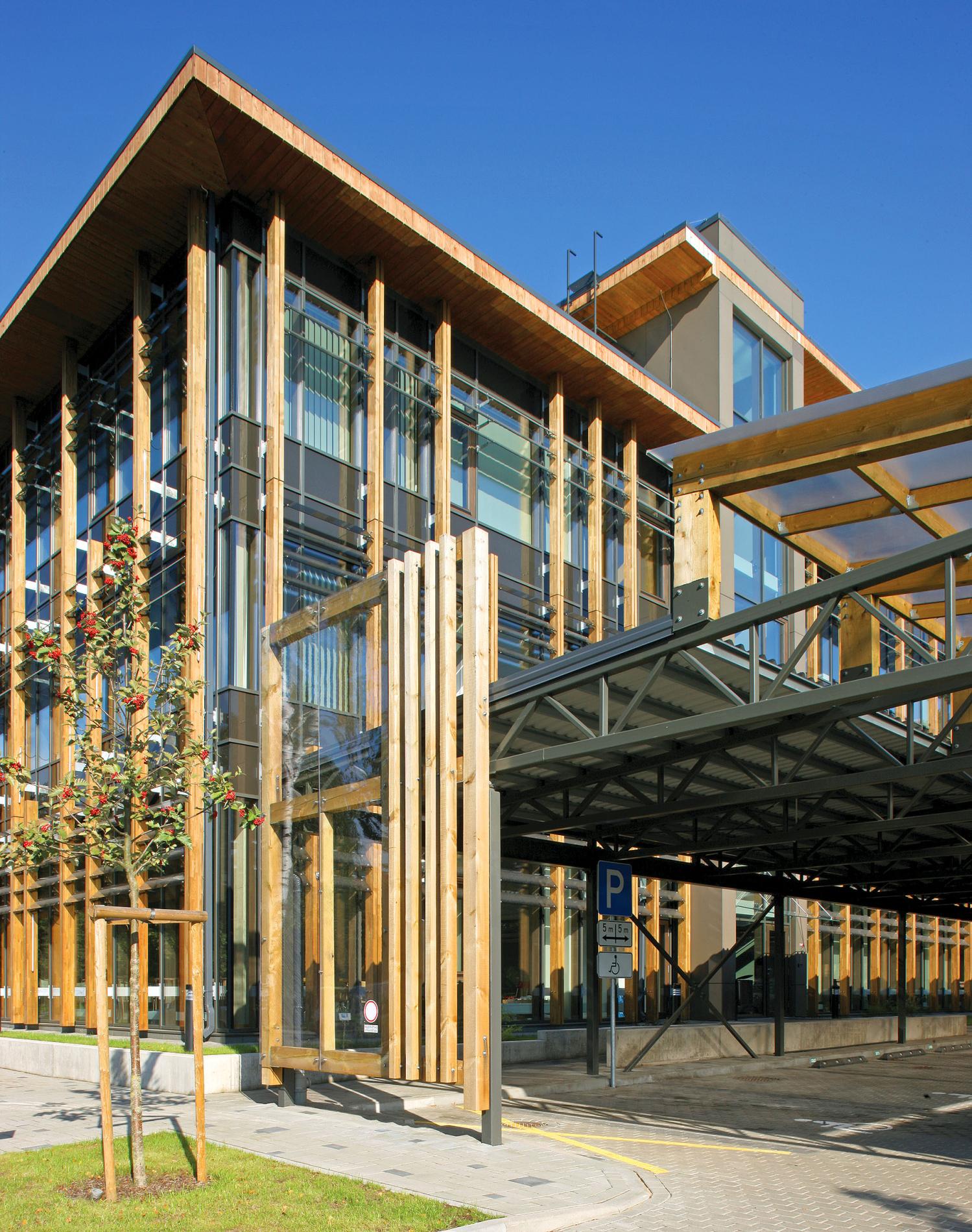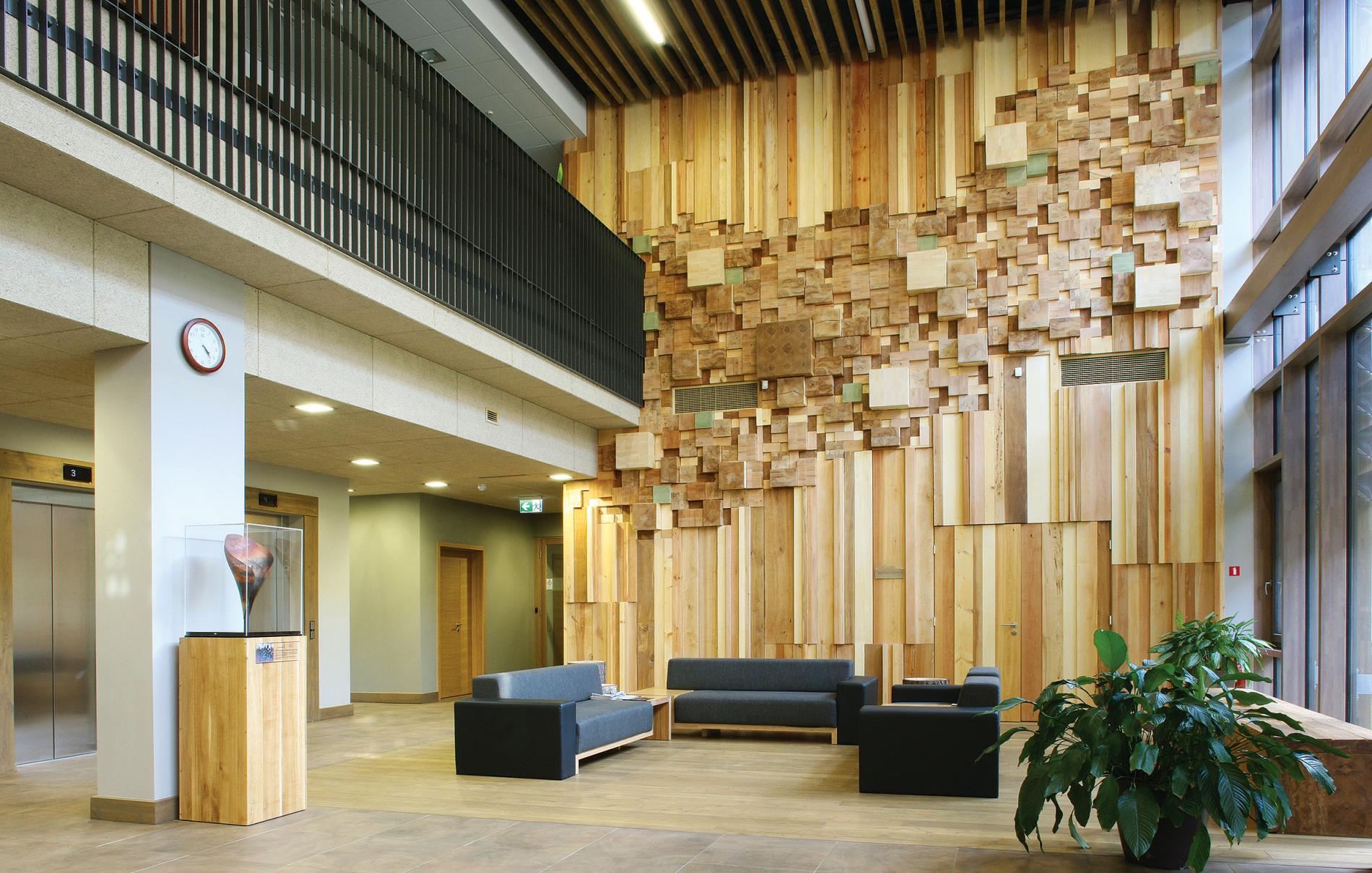 Ieejas vestibils ir vieta, kur ēkas apdarē ir tiešas asociācijas ar mežu. Samērīgi plašās, labi izgaismotās telpas siena divu stāvu augstumā veidota kā skulpturāls objekts - interpretācija par koka dēļu apšuvumu, kurā izmantotas 12 koku šķirnes, eksponējot Latvijas koksnes paraugus. Objekts kompozicionāli labi sabalansēts un spējis integrēt lielas konferenču zāles durvis un pāris vēdināšanas restes. Tas veidots no 46 neregulāras formas paneļiem, uz kuriem uzlīmēti dažādu formu koka elementi, un šie paneļi uzkārti pie sienas ar metāla apakškonstrukciju. Tā kā dažādās koksnes šajā interjera objektā tonāli atšķiras, arī citur telpu apdarē nebija centienu ievērot vienotu koksnes toni.