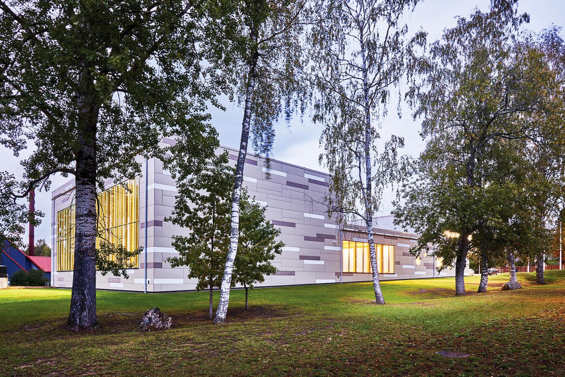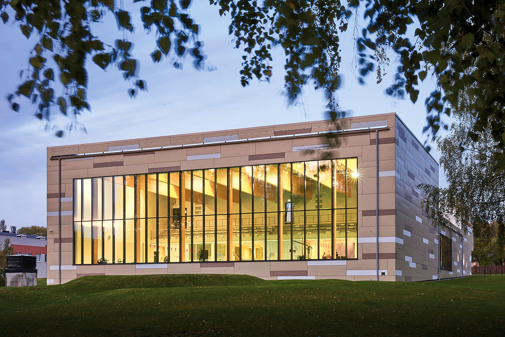 Ēkas arhitektūra ir līdzsvarota, ievērojot mūsdienu energoefektivitātes prasības un ilgtspēju, tās pamatformu veido masīvs bloks, kurā kompakti savietotas nepieciešamās funkcijas. Galvenā ieeja organizēta no stūra, veidojot segtu, iedziļinātu ieejas zonu. Vestibilu plašāku padara ātrijs, kas ļauj ieplūst dabiskajai gaismai. Baltajā askētiskajā telpā izceļas dzeltenā administrācijas lete, kurai pretim ir novietota kafejnīcas lete. Ieejas zona pāriet garderobes zonā ar skapīšiem (virsdrēbju un āra apavu novietošanai), kas rotaļīgi veido māju siluetus.