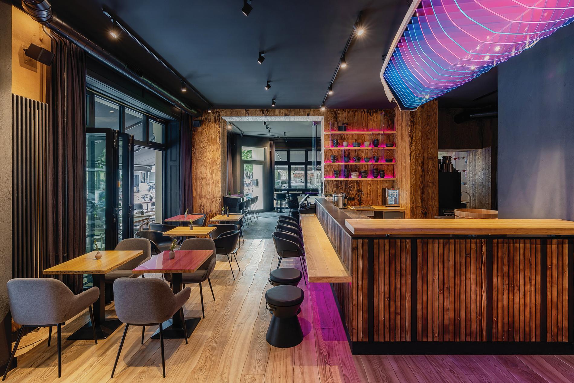 Visu restorāna interjeru caurvij kontrasts starp tradicionālo japāņu dzīvesveidu un pasaules uztveri, mūsdienīgo Tokiju ar raksturīgām rozā gaismām un pārspīlējumiem un natural living. Viss vienots savdabīgā mikslī, ko veido neona gaismas, kopējā tonalitāte un krāsainība fonā - to rada dedzinātie un pat nedaudz mežonīgie, no dabas aizgūtie materiāli. Sintētiskā un dabiskā sajaukums veido «garšīgu» miksli, asociatīvi sasaucoties ar zemūdens pasauli, kur košās un brīžam pat sintētiska izskata zivis mirdz neona krāsās. Tas saplūst vienā stāstā un atspoguļojas arī ēdienā, jo, piemēram, japāņu deserti un konfektes ir luminiscējošas un savā ziņā pat nedabīgas.