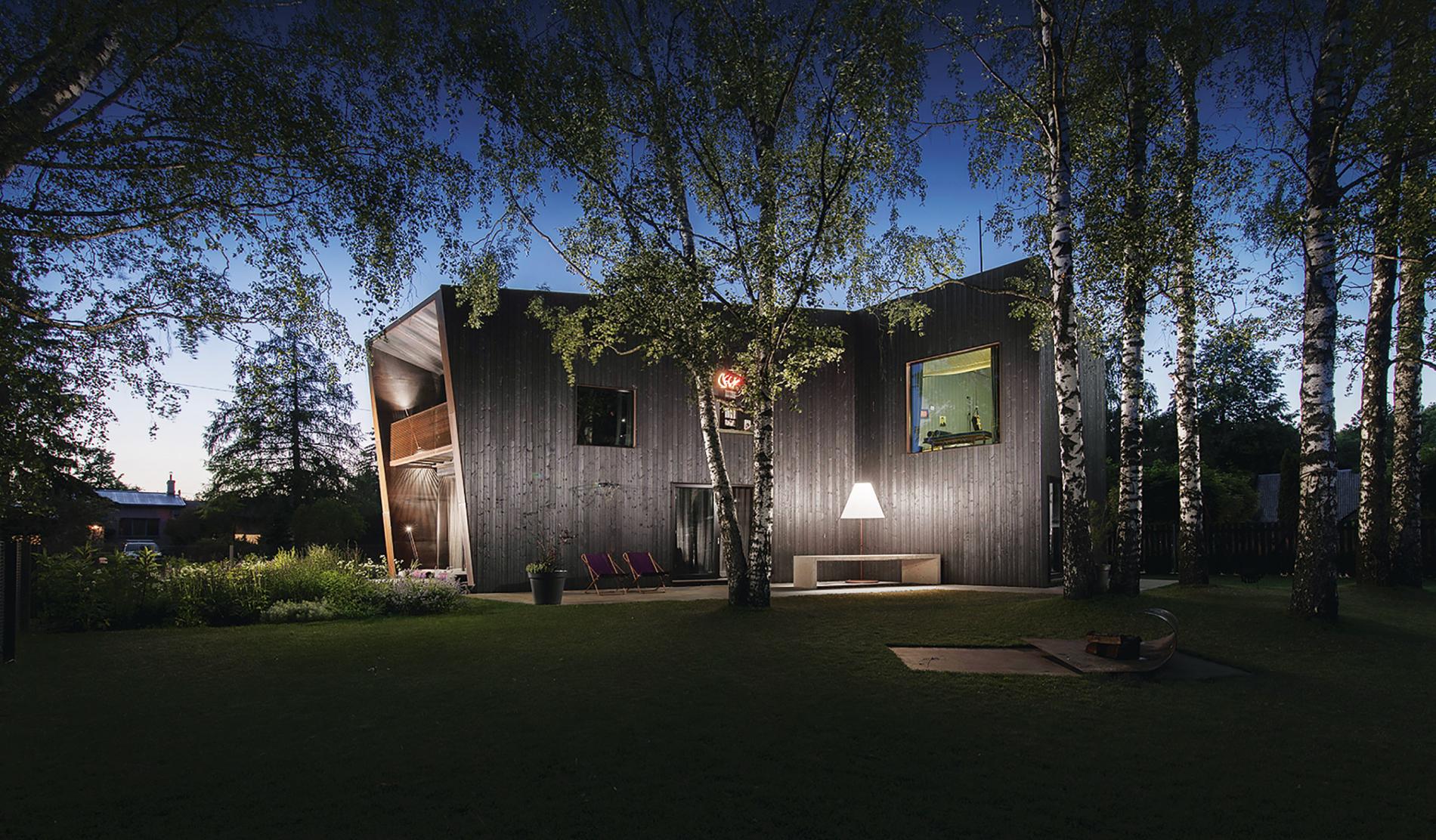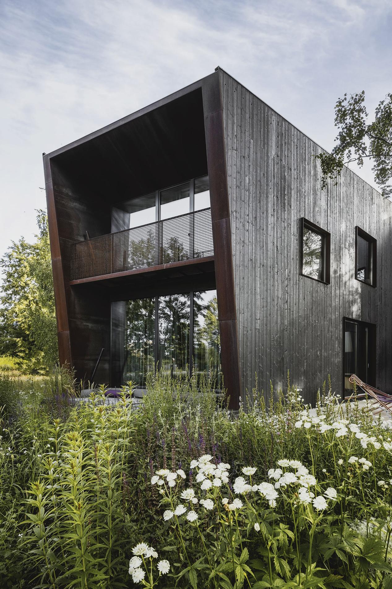 Pret ielu vērstās fasādes stūrī esošā loga gabarīts ir it kā nogāzies, jo novietots ļoti zemu. Pa to redzama rūsināta metāla plāksne, no kuras it kā izaug kinētisks putnu būrītis, kas īstenībā ir gaismeklis. Turpinot metāla tēmu, mājas ieejas zonā izveidots gandrīz klasisks lievenis ar neredzami fasādē iesēdinātām sarūsējuša metāla durvīm un tādu pat apdari. Savukārt dārzā, perfektajā zālienā, atrodas ugunskurs, kas veidots no divām robustām metāla plāksnēm, no kurām viena ir izliekta - efektīgs ugunskura vietas risinājums, kas ir noteikta skatu piesaistoša vieta piemājas teritorijā.