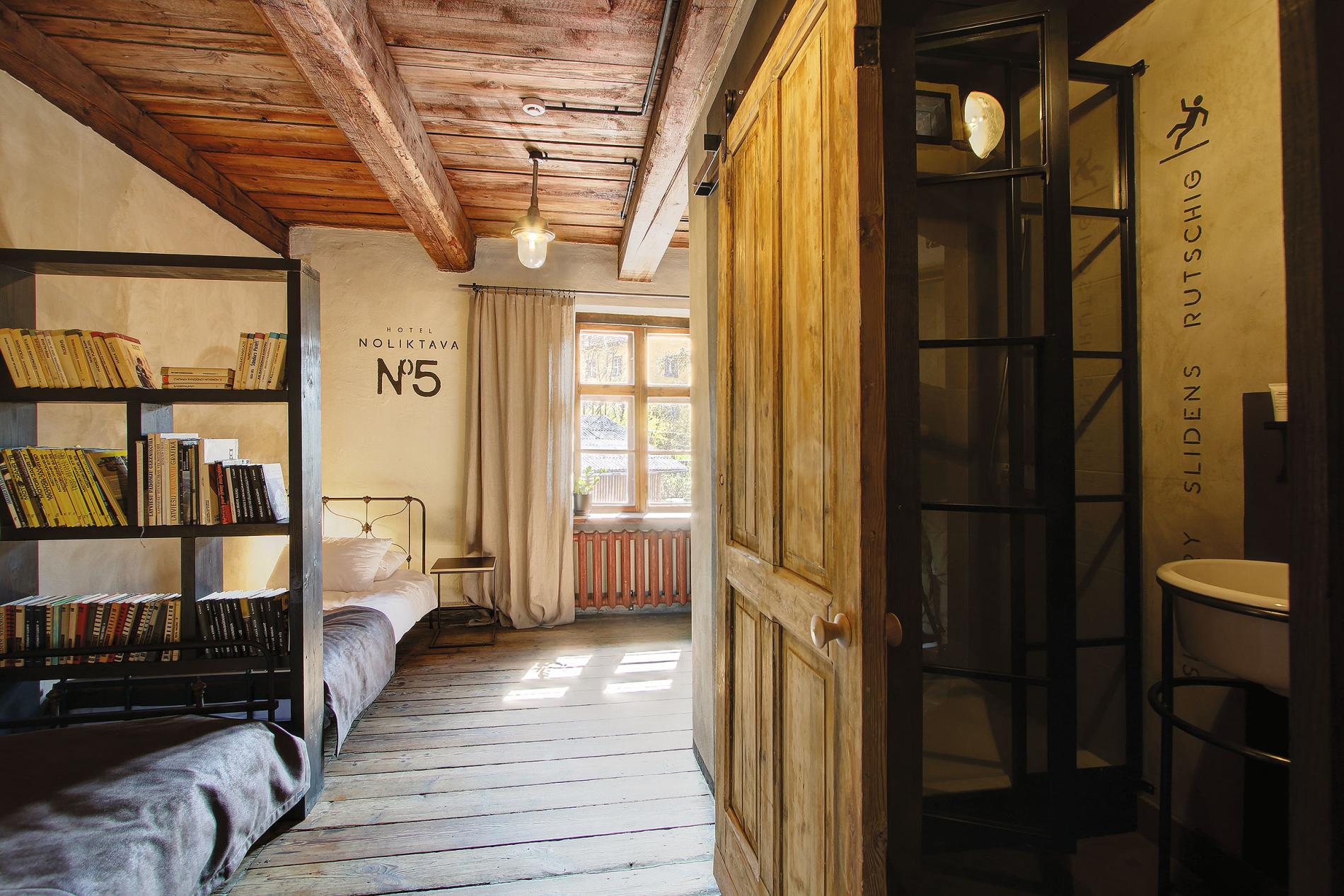 Vannasistabas viesnīcas numuros kā telpās iebūvēti boksi esot skandināvu tradīcija - šis paņēmiens lietots trešajā stāvā. Dušas zona nodalīta ar viengabala stiklu, kas no telpas puses papildināts ar sīkrūtainu melnu metāla rāmi. Vannasistabu bīdāmajām durvīm pielāgotas tepat un citur atrastas vecas koka vērtnes. Grīdas līmenis boksā pacelts, lai izvietotu grīdas apsildi.