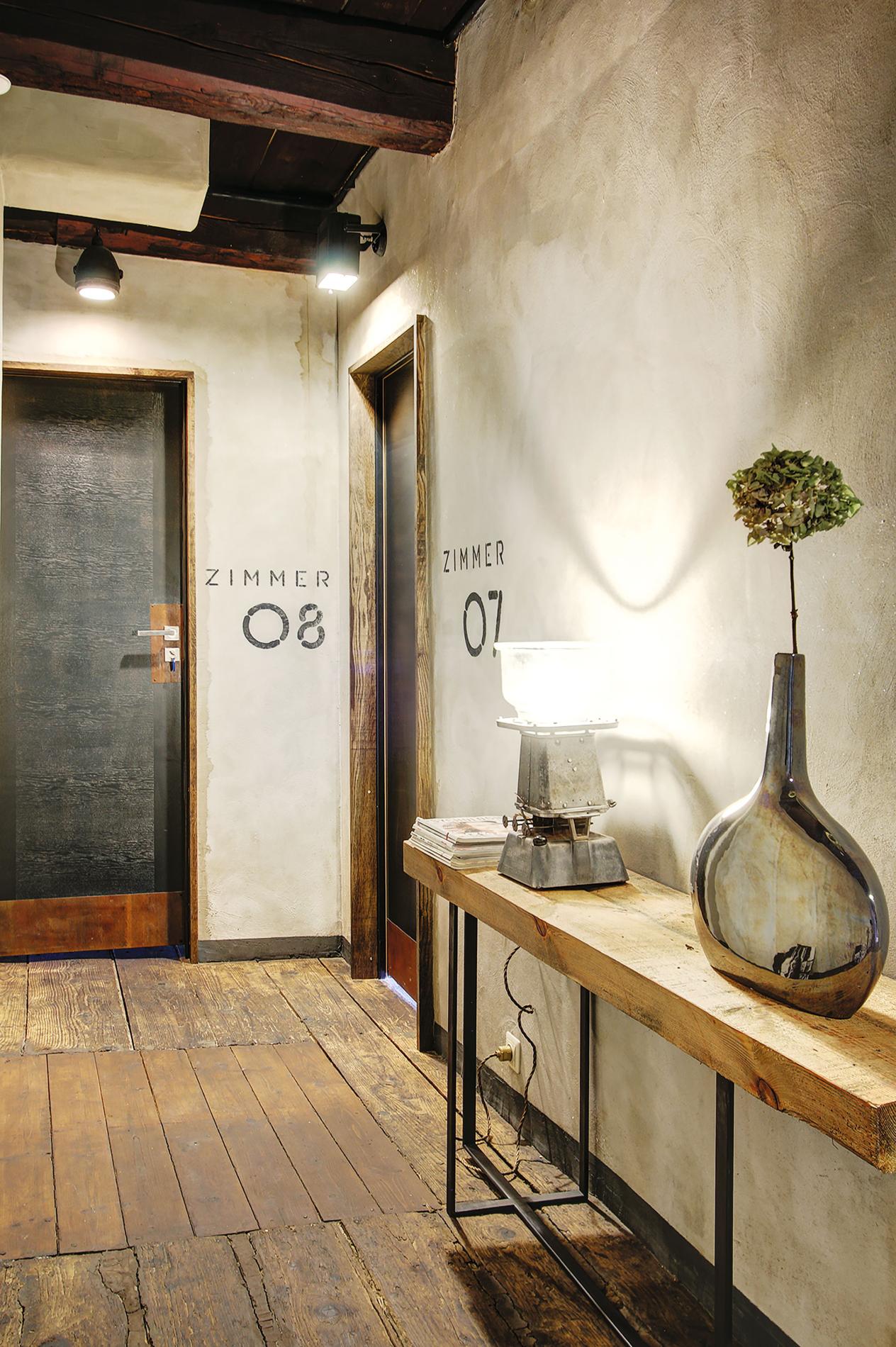 Sienu apdarei izmantotas Edgara Raituma kaļķa krāsas - gan to tehnisko, gan vizuālo īpašību dēļ, kā arī atbalstot vietējo uzņēmēju savstarpējo sadarbību. Rezultāts - telpa ir elpojoša, ar pareizo senlaiku kaļķa un lineļļas smaržu. Vecie logi aizvietoti ar senā parauga koka oderlogiem, neizmantojot stikla paketes, iekšējie slēģi ir oriģinālu kopijas. Trepes ir vecās, bojātais posms aizvietots ar godīgi nemaskētu protēzi. Viesu numuru ārdurvis šeit dzīvo savu otro dzīvi, papildinātas ar rūsinātām metāla plāksnēm augstuma palielināšanai un durvju roktura ierāmēšanai. Vestibila griestu dēļu apšuvums ir jauns - zem tā ievietota skaņas un siltuma izolācija. Centrālapkuri nodrošina granulu katls un veci čuguna radiatori.