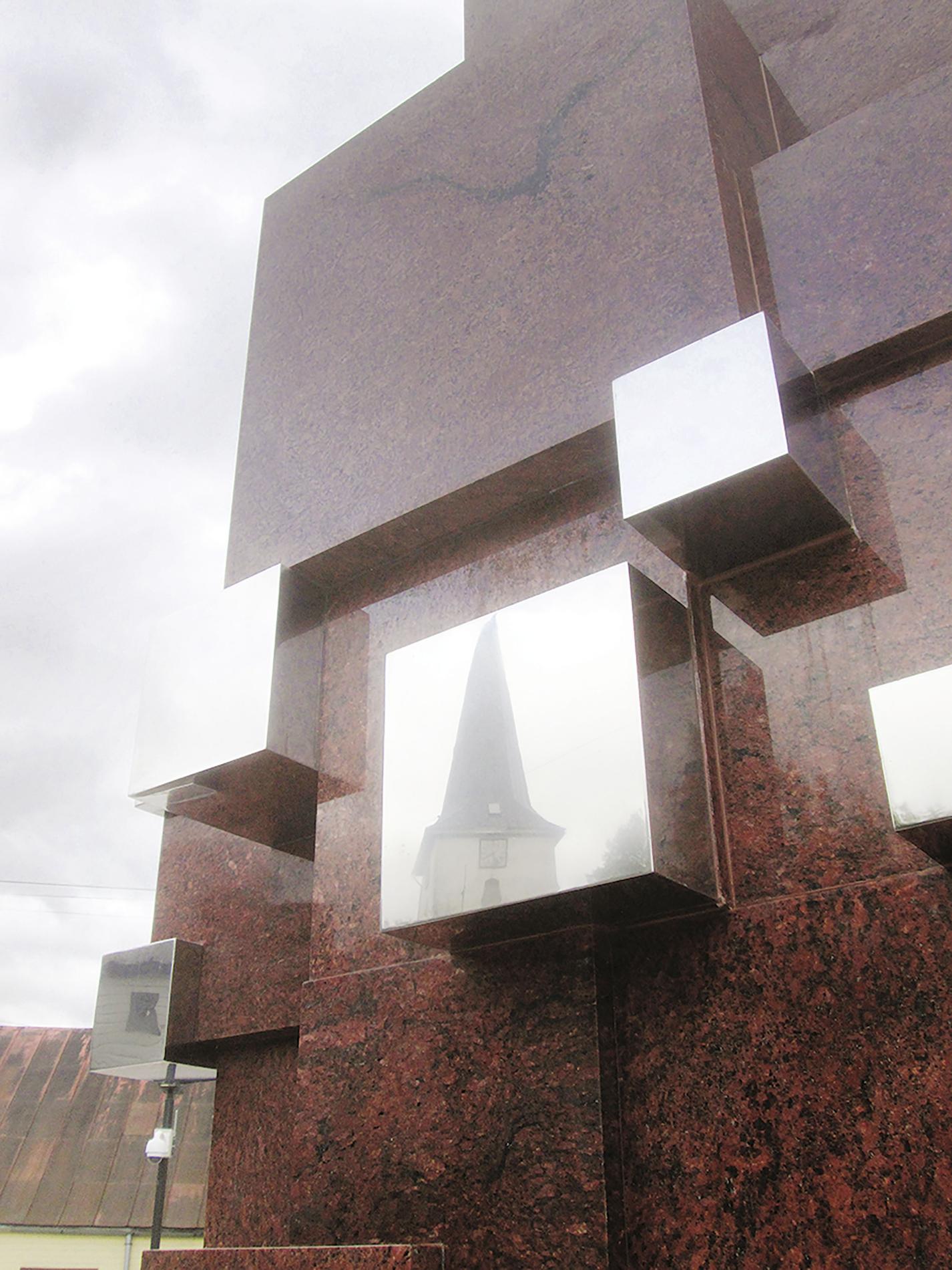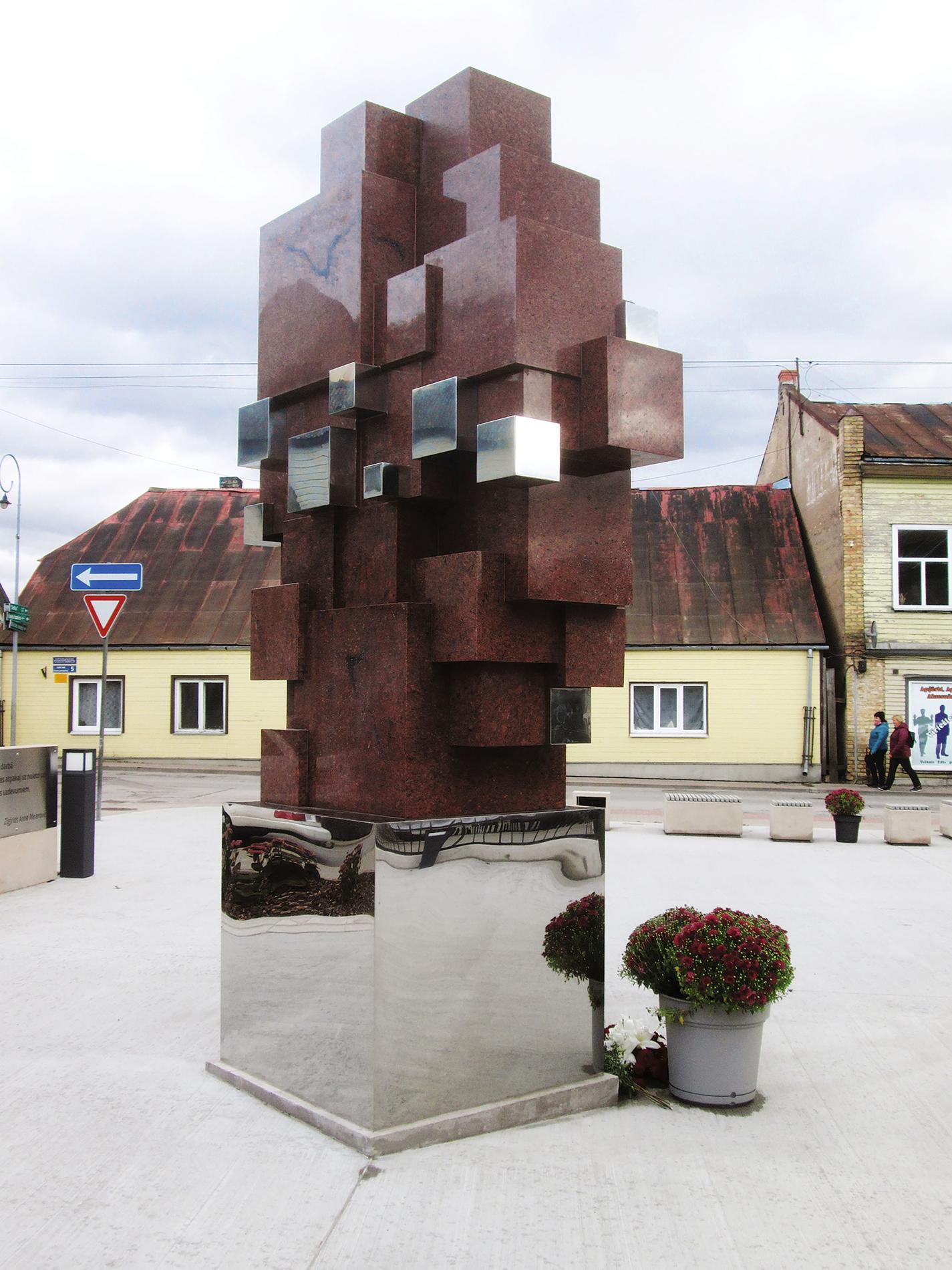Pieminekļa pamatformu, kas novietota uz spoguļgluda pulēta tērauda kuba pamatnes, veido no mazākiem sarkanīga granīta taisnstūra blokiem un blociņiem «sakabināts» monumenta ķermenis. Mākslinieki šādu akmens elementu kārtojumu asociē ar pikseļiem, bet varam salūkot arī analoģiju ar lego principa konstrukcijām. Tās dimensijas saskanīgi ar laukuma un vides mērogu, aptuveni ar aci vērtējot, granīta daļai varētu būt 4 x 2 x 1 m (bet kopā ar metāla postamentu - h =5 m). Uz un ap telpiski izteiksmīgo pamatapjomu veidojas vēstījuma dramaturģija un simbolisms.