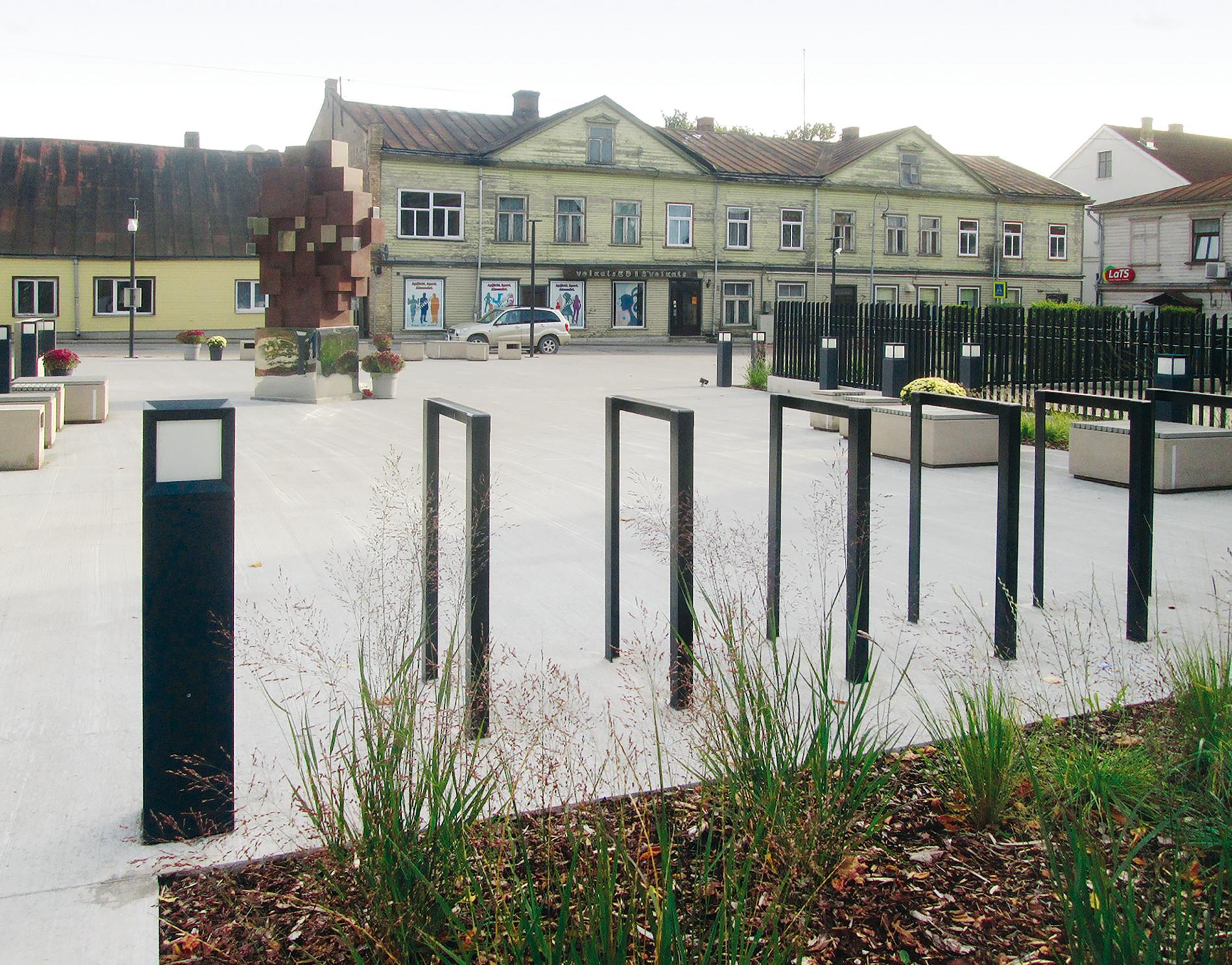 Kā daudziem mākslas darbiem, arī še nozīmīga loma «ierāmējumam», skvēra jeb mākslas darba ekspozīcijas laukuma dizainam, ar ko darbojusies projekta arhitekte Liene Līce. Skvērs ar pieminekli veidots radniecīgā formu valodā un materiālos. Varam baudīt harmonisku ansambļa saskaņu. Pret līdzās esošajām dzīvojamām mājām vērstajā pusē iekopts apstādījumu norobežojums. Laukuma malās novietotas sēdvietu saliņas, kuru betona formās arī nolasām pieminekļa stilistikai tuvu radniecību. Turpat līdzās kā goda sardze rindojas oriģināli metru augsti gaismekļi, melnmetāla prizmatiski stabiņi ar baltiem gaismas kubucīšiem galvgalā. Līdzās arī liela metāla plakne kā atdalījums no pieminekļa pamatnes, kuras funkcija - nest publikai plašāku informāciju par novietoto mākslas darbu. Visu laukumu klāj gaišs betona segums, kura askētiskais plašums it kā vedina skatienu fokusēties tikai uz monumenta stalto stāvu.