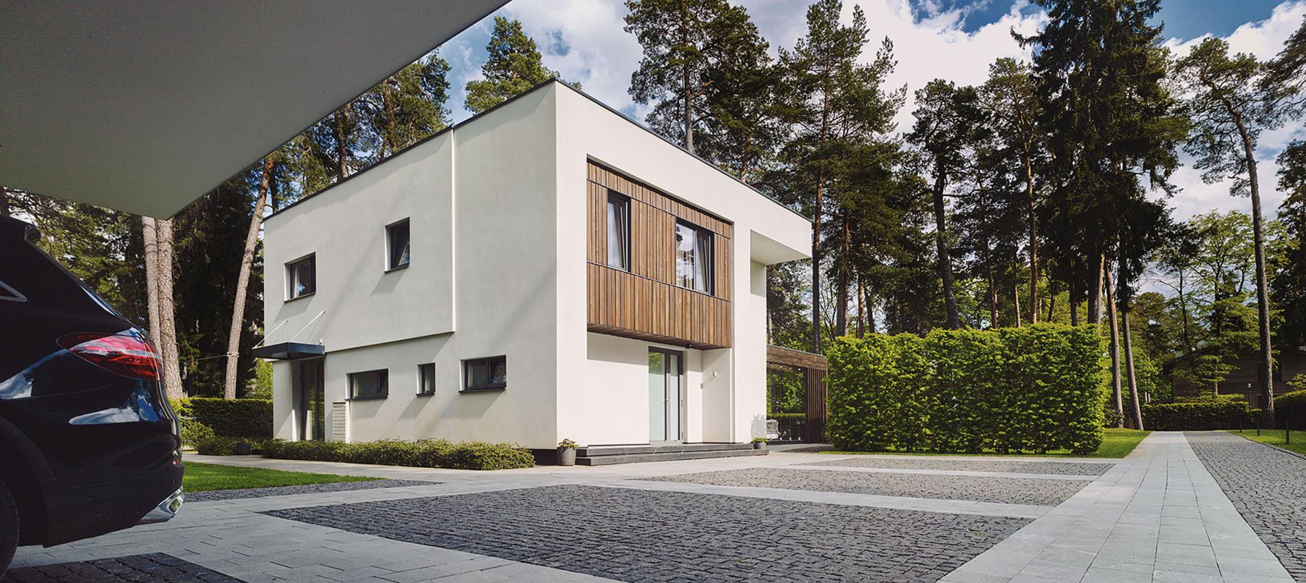 Organiski un pilnīgi loģiski, lai gan ne pēc oriģinālajiem metiem, ir atrisināts mājas piebraucamais ceļš. Ar nelielu loku nobīdīts nostāk no ass, tas labāk ierakstās starp pagalma priedēm. Arī mājas ekspozīciju, iebraucot pagalma teritorijā, ceļš atklāj pakāpeniski. Tāpat galvenā ieeja mājā risināta diskrēti - tā izvietota sānos un aizsegta ar ainavu arhitektūras biroja «Landshape» piedāvāto dzīvžoga zaļo sienu.