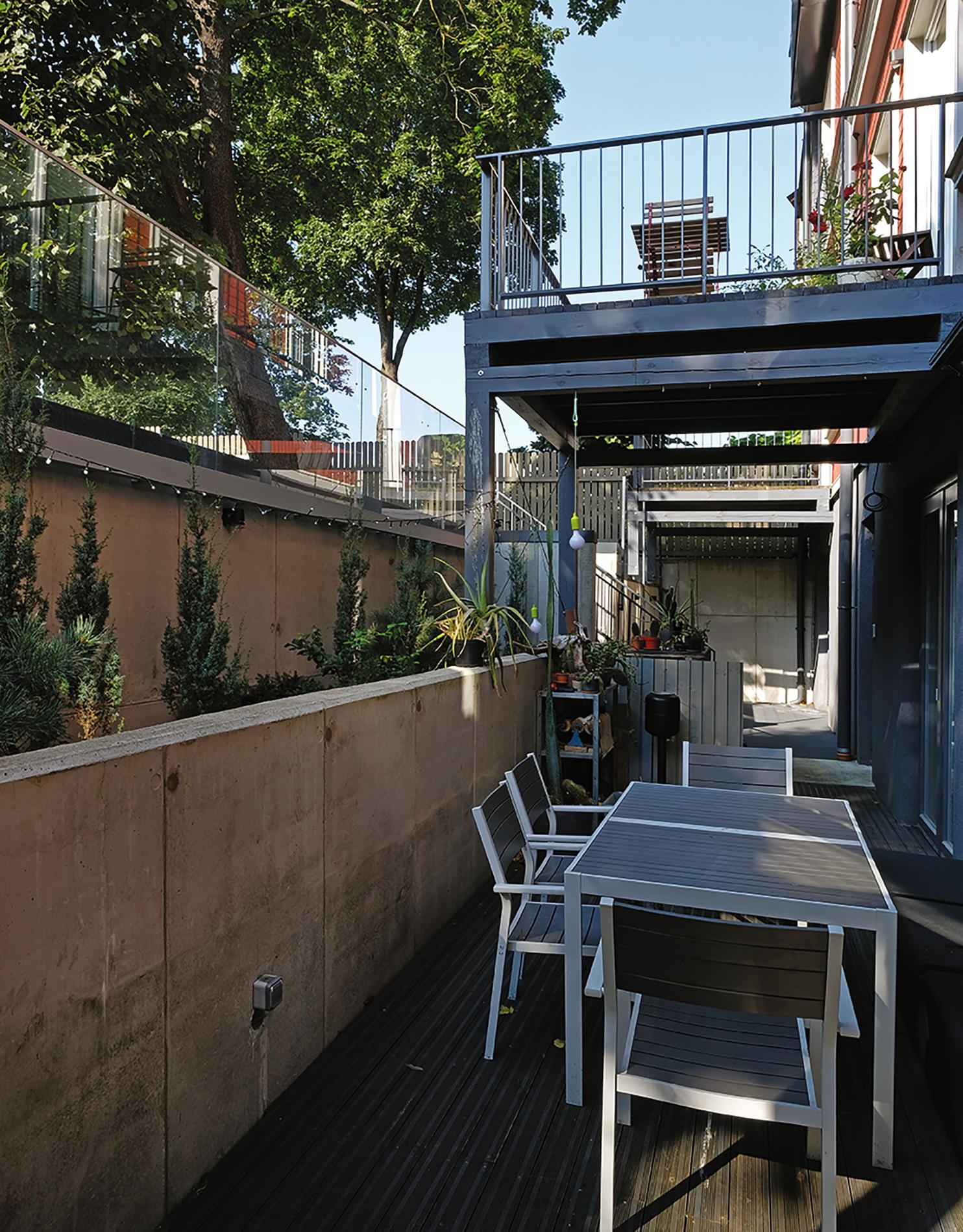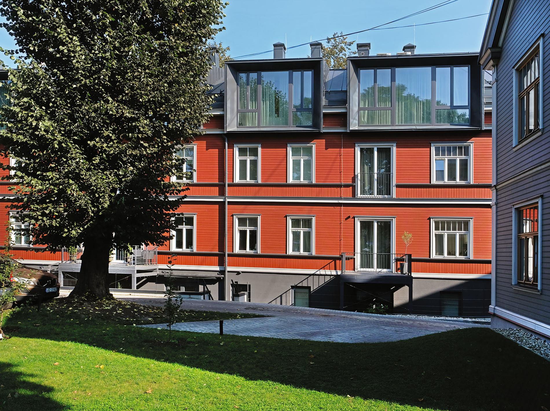 Lai labiekārtotu pagraba telpas, sētas pusē norakts paprāvs augsnes slānis un veidoti iedziļināti, lieli logi, kas pagrabu padara gandrīz līdzvērtīgu citu stāvu telpām. Turklāt pie izveidotajiem logiem iekārtotas ērtas terases, kas ir mājokļa pievienotā vērtība. Tiem, kas arī pārējos stāvos vēlējās lielāku tuvību ar ārtelpu, sētas pusē izveidoti nelieli balkoni vai franču balkoniņi. Namam saglabāts koka karkass, pārsegumi, arī kādreizējās arkas, atjaunotas agrākās jūgendstila koka kāpnes, margas un fasādes dekoratīvie elementi, bet fasādes apdares dēļi ir nomainīti.