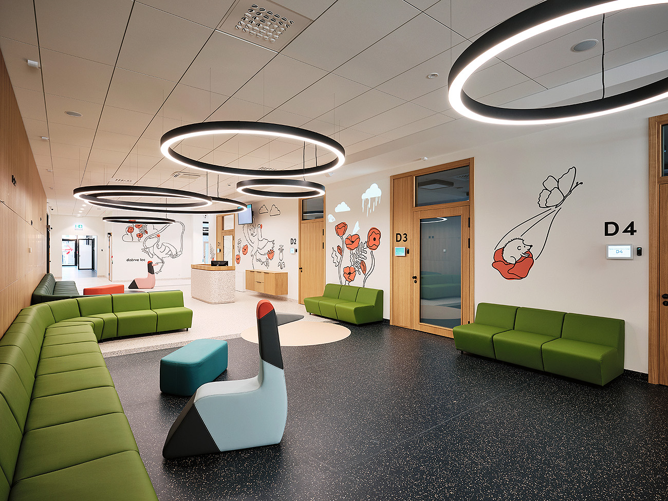 Šim nolūkam kalpo arī brīnišķīgie dizaina studijas H2E grafiskie risinājumi - zīmējumi uz telpu sienām un interaktīvās grafikas, kas slimnīcas telpām piešķir gluži vai atpūtas centra auru. Dizainere Ingūna