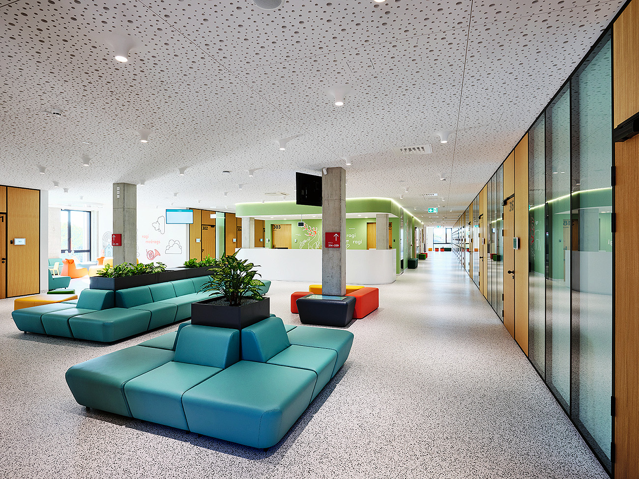 Katrā ēkas stāvā apdarei izmantota sava vadošā krāsa. Pirmais stāvs veidots gaišs ar dažādu krāsu akcentiem, augstākos stāvos izmantoti zilie, zaļie, terakota toņi. Košas veidotas publiskās labierīcības (ar divu augstumu izlietnēm un sēdpodiem), kas ērti pieejamas arī mazajiem pacientiem. Interesanti, ka dažviet koši krāsoti arī telpu griesti, kas interjeram piešķir rotaļīgu iespaidu un pilnībā nojauc jebkādu iespaidu par medicīnas iestādi.
