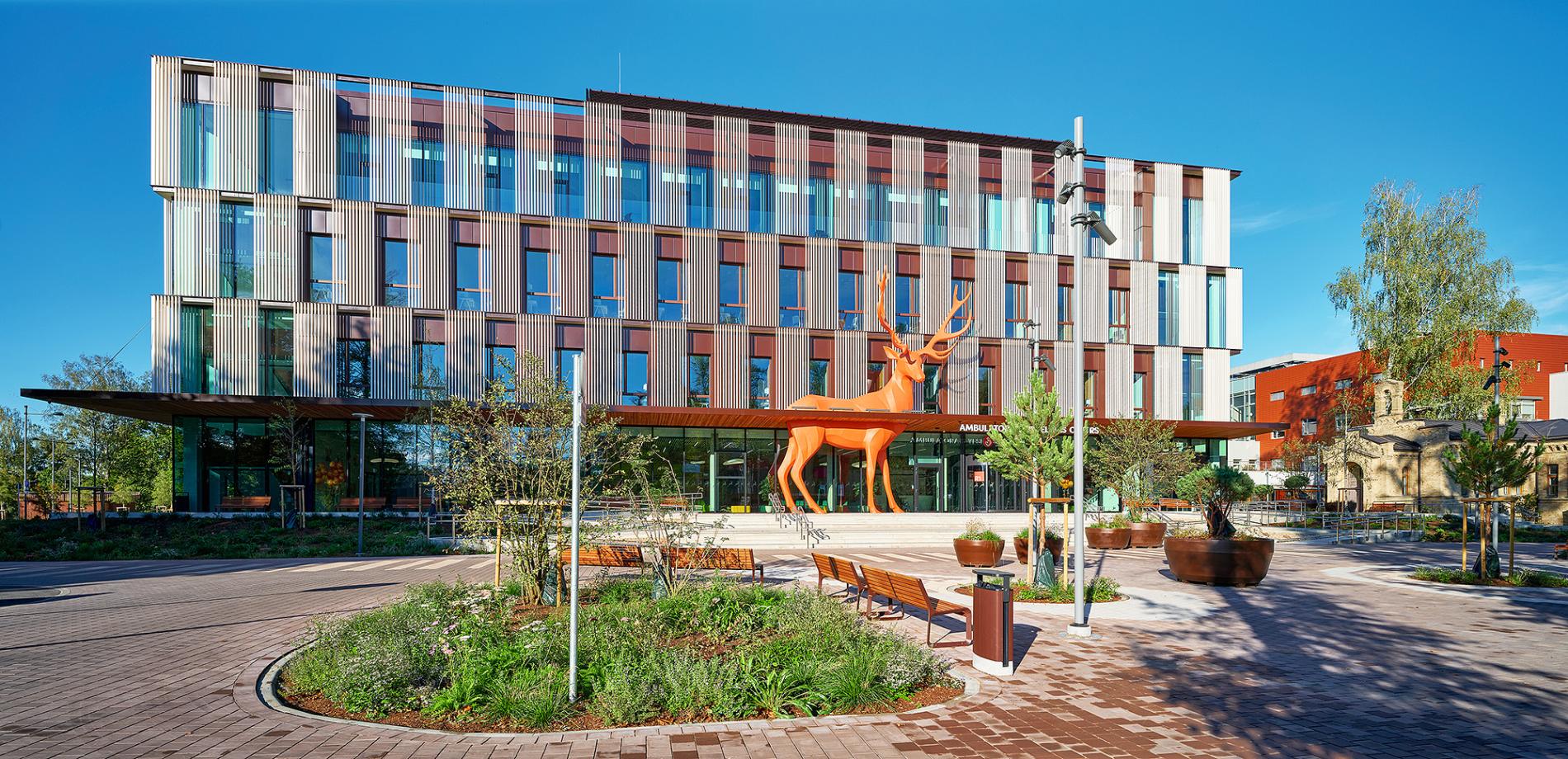 Pie Neatliekamās medicīnas centra izveidota autostāvvieta pacientiem un personālam ar iebraukšanu no Indriķa ielas. Atbilstoši dzērves tēlam (kas dzīvo purvā) te izveidoti lietusdārzi, ilgtspējīgi ūdens risinājumi ar bioievalkām, tādējādi nojaucot slimnīcas iespaidu. Savukārt briedis pie Ambulatorā veselības centra stāv pļavā, šeit veidotas bagātīgu stādījumu dobes. Pie galvenās ieejas ir plaša pandusu sistēma, lai būtu ērti piekļūt no abām pusēm.