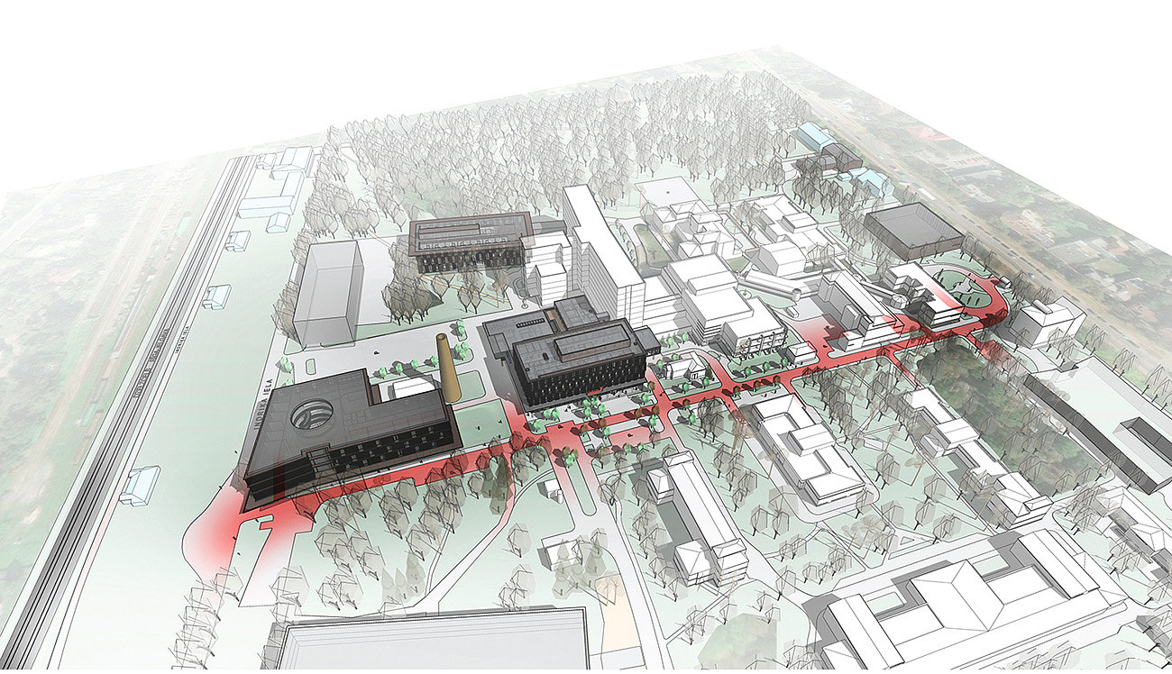 Teritorijas galveno asi veido agrākais ceļš cauri slimnīcai no Vienības gatves uz dzelzceļa pusi, kas tagad pārvērsts par promenādi. Centrālā ass teritoriju iedala trīs daļās: uz vienu pusi no centrālās ass ir vēsturiskie korpusi, parkveida apbūve, vidū ir tā sauktais zirneklis jeb intensīvāka mūsdienu apbūve ar daudzfunkcionālu korpusu, bet uz otru pusi - neskarta rekreācijas teritorijas daļa, parks.