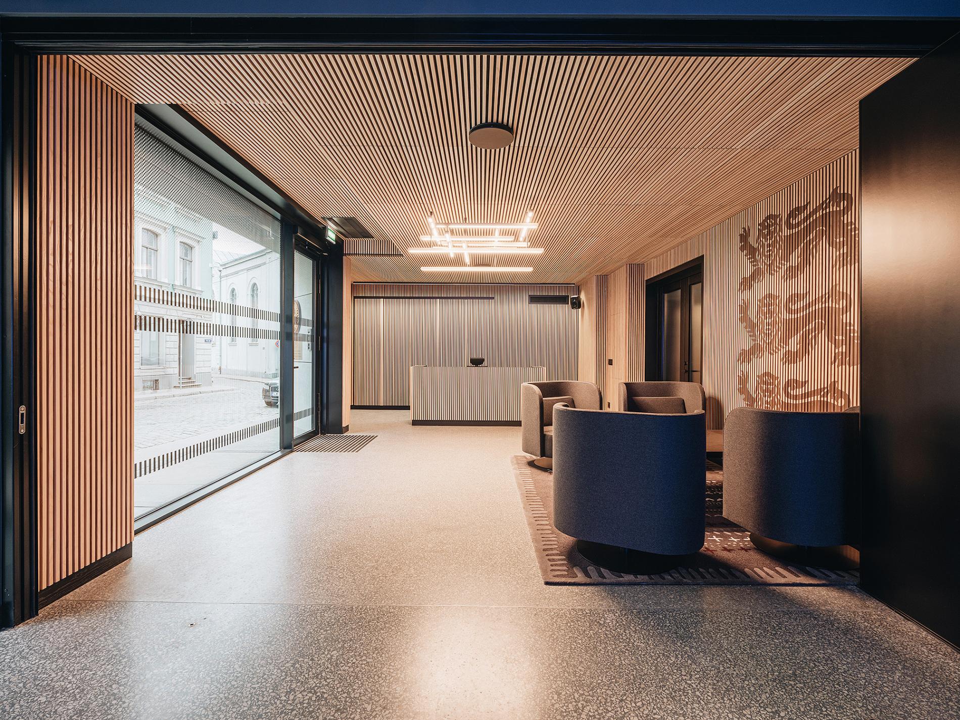 Pils ielas fasādes plašie stiklojumi pirmajā stāvā precīzi atbilst open embassy koncepcijai - paver skatu ēkas iekšpusē, kas ir laba iespēja plašākai publikai atklāt tās saturu. Lai arī vēstniecība ir tāda kā valsts valstī, no saskaņošanas viedokļa tai ir vienkāršs biroju ēkas klasifikācijas kods. Vēstniecībām galvenokārt ir valsts reprezentēšanas funkcija, telpu programmas ir ļoti dažādas atkarībā no darbinieku skaita un veicamajām darbībām, tomēr nemainīgs ir viens - tajās ir publiski pieejamā un publiski nepieejamā daļa. Vēstniecību iekārtojumam vienmēr tiek pievērsta īpaša uzmanība. Jaunajai Igaunijas vēstniecības ēkai ir salīdzinoši plaša telpu programma, un jau no projektēšanas sākuma labs telpu dizains un igauniskais bijis absolūta prioritāte.