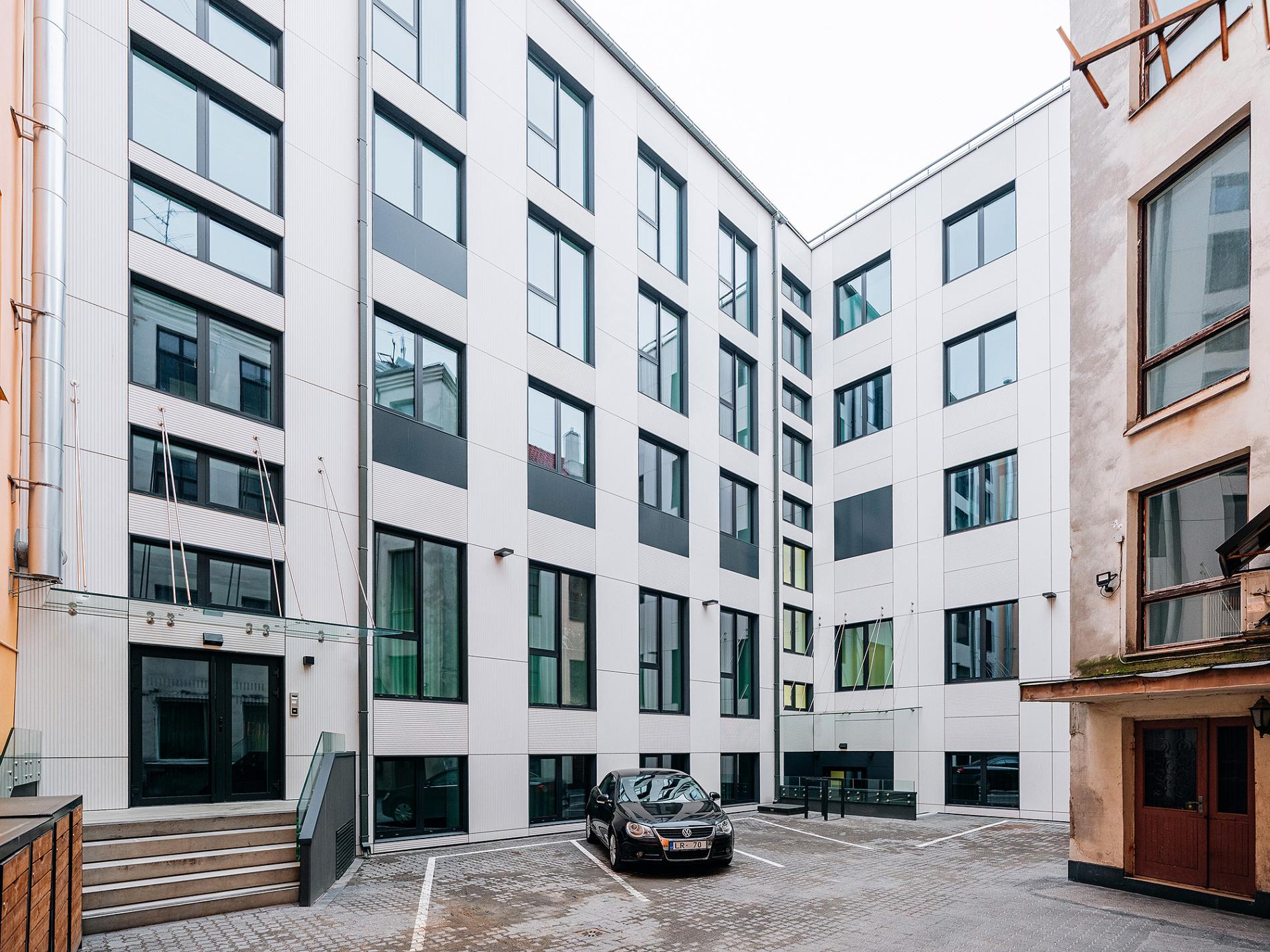 Fasādes kompozīcijā tiek stilizēts vēsturisku ēku trīsdalījums - cokols, fasāde, mansards. Pirmā stāva fasāde ir kā cokols, tikai stiklots, otrais un trešais stāvs stilizē logu dalījumu, bet ceturtā un piektā stāva fasāde atdarina mansarda jumtu, kuram ir logu izbūves. Šajā fasādē ir divas logu izbūves, kuras it kā turpina apakšējo stāvu fasādi un piešķir ēkai savdabīgu raksturu. Sestais stāvs ir tehniskais stāvs bez logiem ielas pusē un jumta formas dēļ praktiski nav uztverams no ielas. Pirmo trīs stāvu fasāde veidota kā liels akmens profilu režģis, kurā iestrādāts stiklojums. Augšējie trīs stāvi ievīstīti cinkota skārda segumā. Jau no ieceres pirmsākumiem bija skaidrs, ka fasādei tiks izmantots Kaarma dolomīts no Igaunijas. Fasādes akmens profilu režģis ir viena no tehnoloģiski sarežģītākajām ēkas struktūrām. Tai ir nesošs metāla apakšrāmis, uz kura īpašā iekares sistēmā stiprināti no pilnmasas izfrēzēti daudzšķautņaini akmens profili. Katrs akmens elements izgatavots vienā eksemplārā, jo režģim apzināti veidoti dažādi šķērsgriezuma leņķi, lai vienlaikus fasādē būtu dažādas gaismēnas, pastiprinot telpisko sajūtu, ko diennakts tumšajā laikā papildus izceļ fasādes apgaismojums. Fasādes akmens daļas konstrukcija bija jāsalāgo ar stiklojumu bez papildu elementu eksponēšanas. Bez pārspīlējuma var teikt, ka šis fasādes mēroga juvelierdarbs ir unikāls ne tikai Latvijas mērogā, tādēļ garāmgājēji bez kautrēšanās var piestāt un papētīt, kā tas veidots. Iekšpagalma fasāde mainīta nebūtiski, bet nosiltināta un apšūta ar fasādes plāksnēm. Pats iekšpagalms atvēlēts dažām autostāvvietām, tam mainīts segums.