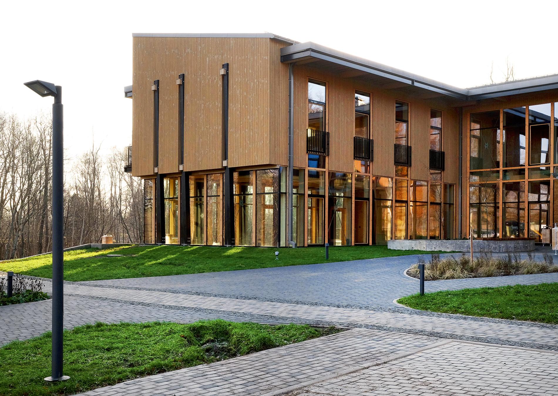 Ieejas reprezentatīvo raksturu un apjoma simetriju uzsver arī priekšpagalma labiekārtojums ar dažādu krāsu betona bruģa iesegumā brīvi iekomponētām zāliena un dekoratīvo apstādījumu dobēm, individuāli projektētajiem labiekārtojuma elementiem. Centrā izvietots lokveida formas soliņš ar koka elementu sēdvirsmu - tam fonā leģendārais uz piecu latu naudaszīmes redzamais ozols. Zemesgabalu virzienā no pils parka līdz koka tiltam pār Alaksti šķērso iedibināts gājēju celiņš. Priekšpagalmā projektēta autostāvvieta klientiem, ēkas sānos ziemeļu daļā paredzētas autostāvvietas personālam un elektroauto lādēšanas stacija, bet kreisajā pusē, izmantojot līmētā koka konstrukcijas, vienotā stilistikā ar galveno ēku projektēta nojume auto un tehnikas novietošanai - kopā 74 automašīnu un 1 autobusa stāvvieta. Teritorija otrpus ēkai tālākajā plānā līdz Pācei attīrīta, un izveidotas atpūtas vietas - solu grupa un lapene, ko varēs izmantot gan ēkas lietotāji, gan vietējie iedzīvotāji. Ēkas ziemeļu pusē projektēts saimniecības pagalms ar ieeju ēkas pazemes stāva palīgtelpās.