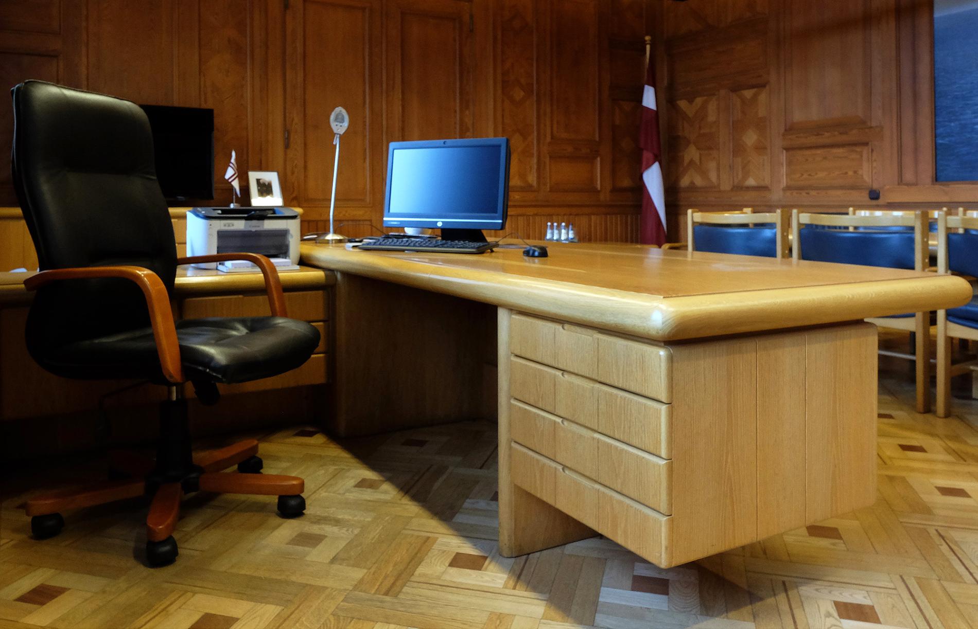 Ar noapaļotiem stūriem un ārējā pusē nedaudz izliektā rakstāmgalda virsma balstās uz taisnstūra formas galda kājas, un pie šī balsta elementa simetriski katrā pusē piestiprināti vienāda izmēra skapīši ar izvelkamām atvilktnēm. Šāds stiprinājuma veids piešķir galdam vieglumu un eleganci. Ērtumam konstrukciju papildina vēl viena daļa - pakārtotais galds, kas ir nedaudz zemāks, novietots sānos, un tam piestiprināti divi skapīši. Iepretī premjera krēslam galda virsmas biezumā iestrādāta neliela atvilktne, kas nav īpaši pamanāma, tātad, iespējams, izmatojama kādām slepenām lietām.