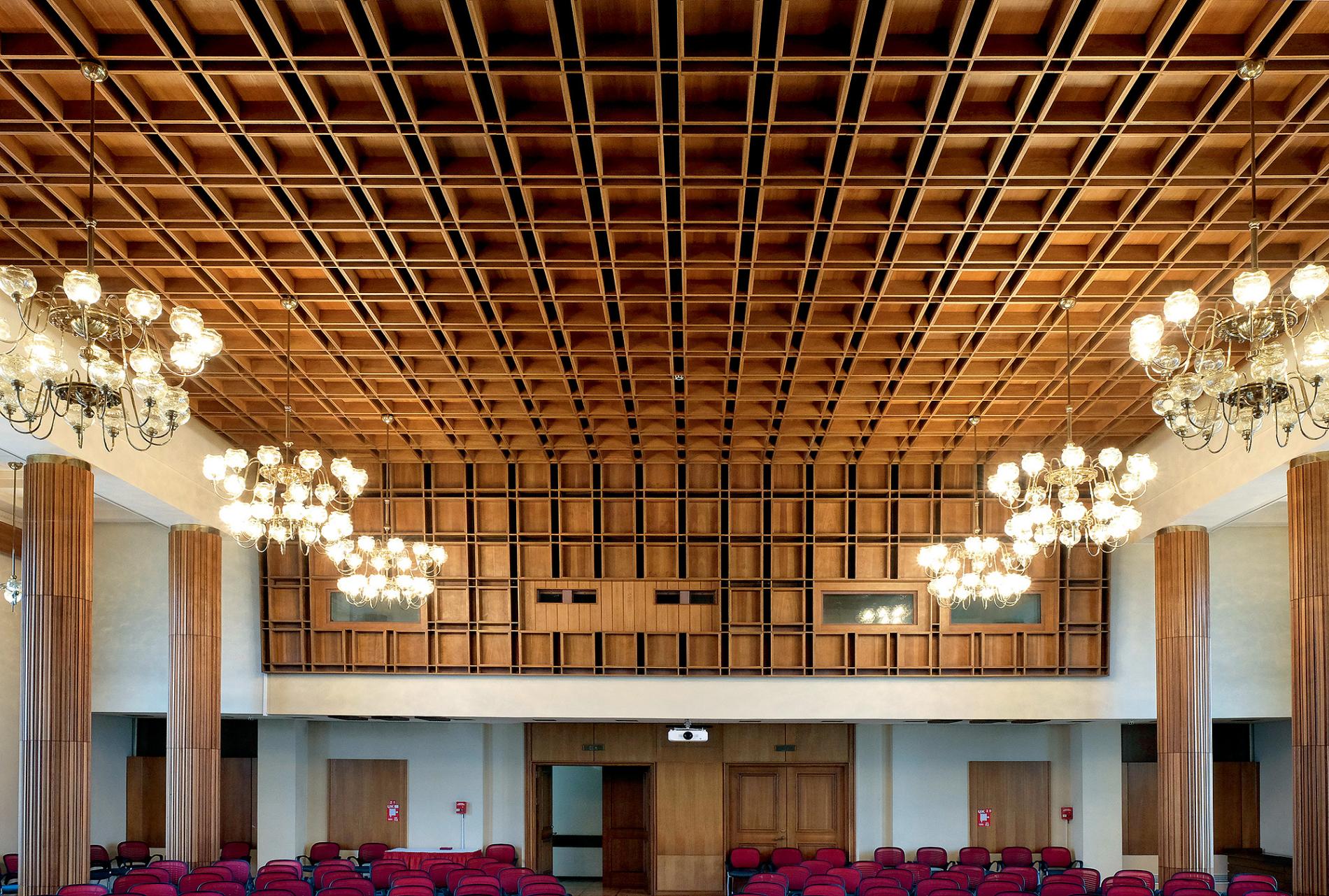 Sēžu zāles piekārto griestu konstrukcija veidota no ozolkoka finierējuma mēbeļu platēm, atsevišķas detaļas ir no masīva ozolkoka. Kasetējuma ritms un proporcijas lielo, ar kolonnām balstīto telpu nosacīti savelk kopā, piešķirot tai svarīgumu un nopietnību 20. gs. 80. gadu dizaina izpausmju noskaņā. Kolonnu jaunizveidotā koka detaļu apdare stilistiski līdzinās ēkas galvenās ieejas portāla dorisko kolonnu kanelūru rotājumam, radot sasauci ar iepriekšējo laikmetu.