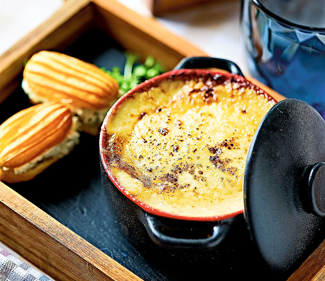 PasniegšanaNo krāsns uz galda - tajos pašos podiņos! Restorānā žuljēnu pasniedz ar eklēriem, kas pildīti ar svaigā siera krēmu.