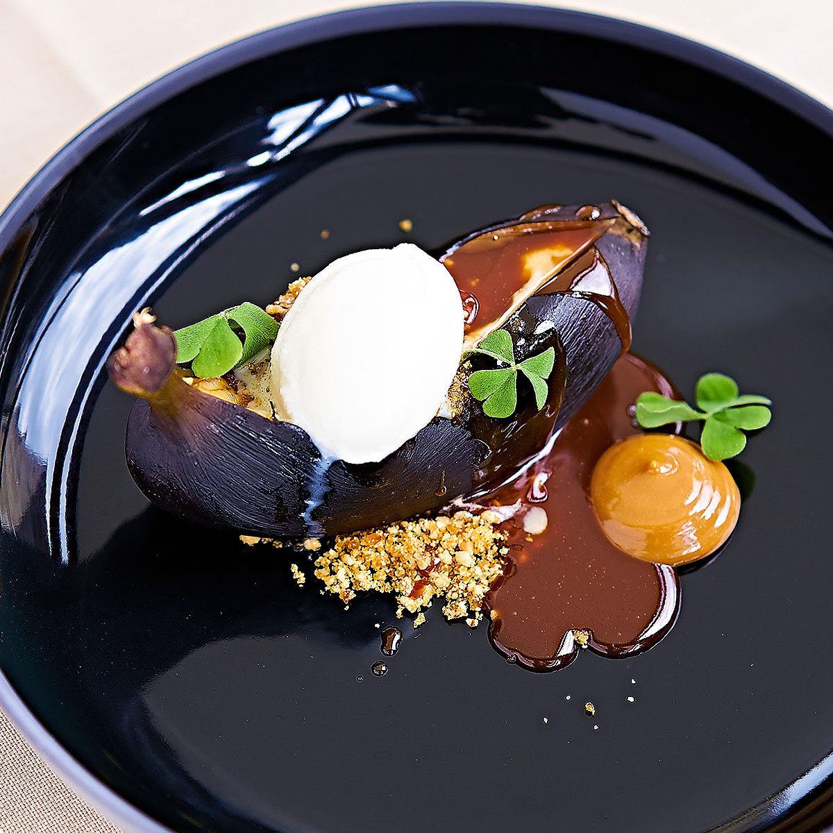 Pasniegšana Pārgriez banānu mizu gareniski, atver, pārlej banānus ar sāļo karameli, pārkaisi ar riekstiem un uzliec bumbiņu vaniļas saldējuma.