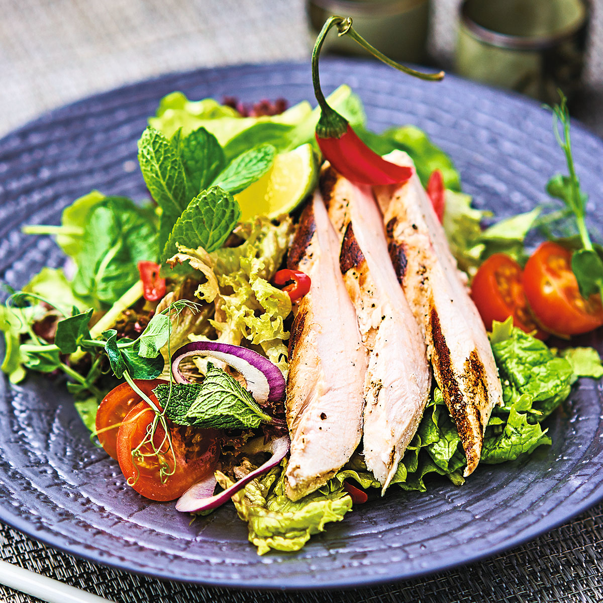 Pasniegšana Uz šķīvja izliekam salātus un siltu vistas fileju.