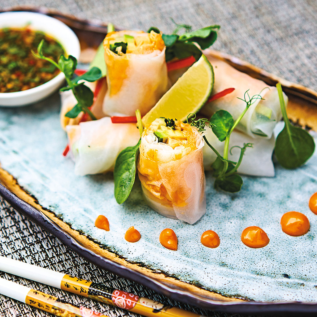 Gatavošana Nūdeles pārlejam ar karstu, vārītu ūdeni un ļaujam nostāvēties 3-5 minūtes. Vjetnamas rīspapīru pa vienai lapai izmērcējam siltā ūdenī, līdz tas kļūst elastīgs. Pēc tam lapas vidū liekam sagrieztus Ķīnas kāpostus, nūdeles, aptuveni 10 cm garumā sagrieztu gurķu, avokado un sarkano sīpolu strēmelītes, maurlokus, koriandru, rīvētu laima mizu un smalcinātus čili piparus. Pārlejam ar čili mērci un majonēzi. Rīspapīra lapu no abām pusēm aizlokām ciet, lai neizbirtu pildījums, un satinam četrus rullīšus.