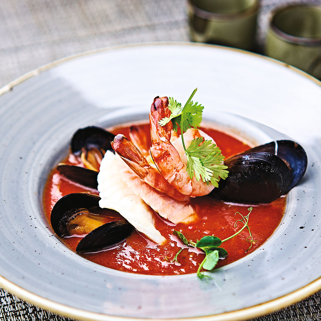 olīveļļā. Pārliekam katliņā, pievienojam tomātu biezeni un zivju buljonu, uzvārām. Tad pievienojam zivis, jūras veltes, sāli, piparus un dažus pilienus ķiploku eļļas. Vārām vēl 2-3 minūtes.