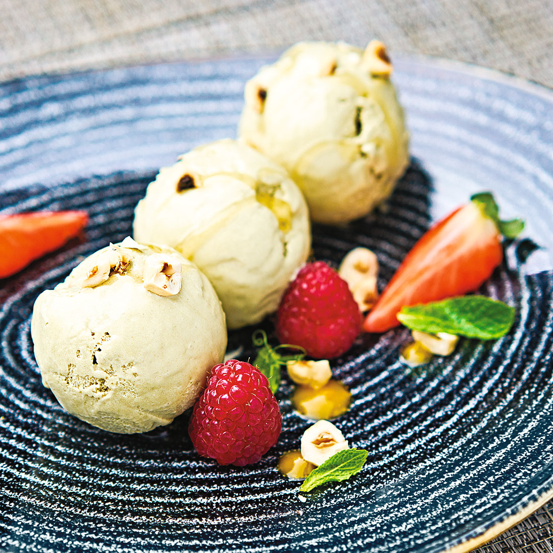Pasniegšana Desertu dekorējam ar riekstiem vai ogām.