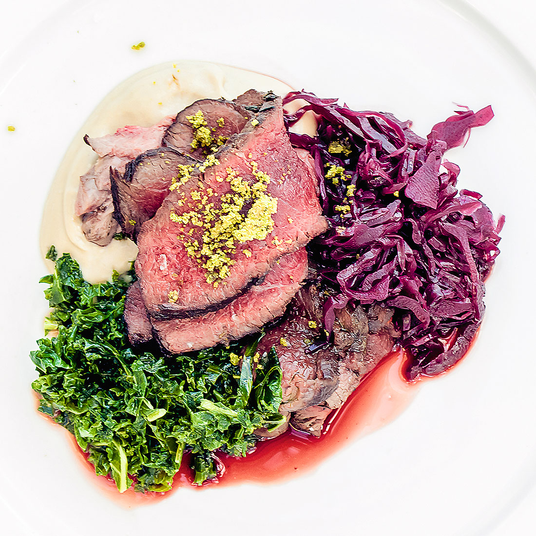 Uz uguns gatavota Brieža gaļa biešu-sarkanvīna mērcē ar baraviku krēmu