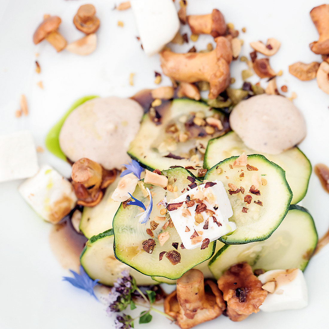 Pasniegšana Šķīvī liec lielu karoti kazas siera un jogurta masas, pārliec cukīni šķēles, pārkaisi ar riekstu un sukāžu maisījumu un pārlej ar alus sīrupu. Līdzās izkārto salātlapu maisījumu.