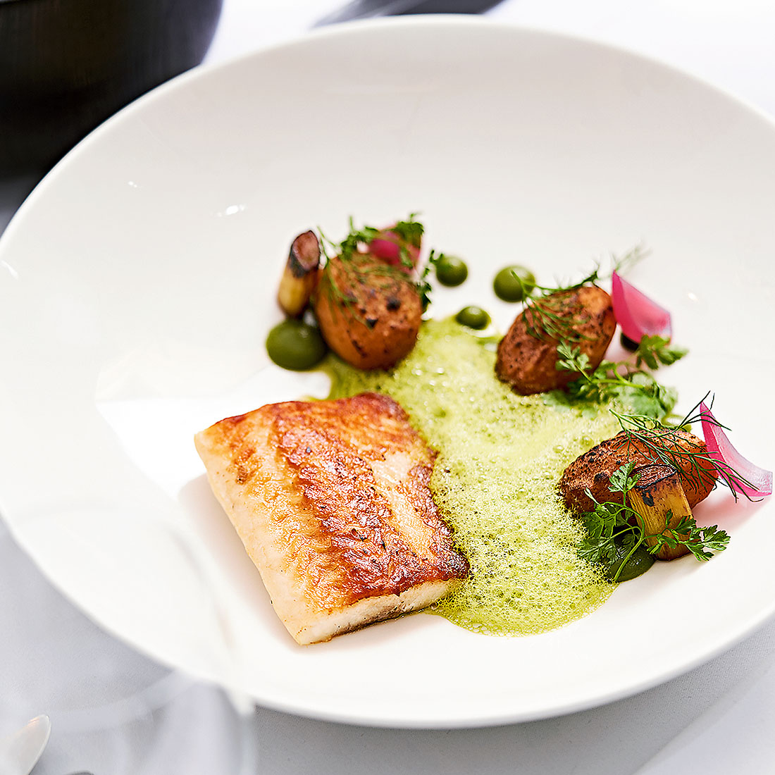 Cepta stores fileja ar kartupeļu fondantu un gurķu un mārrutku mērci