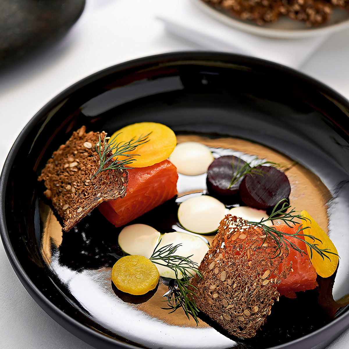 Kūpināts foreles konfits ar mārrutku un marinētu biešu mērci