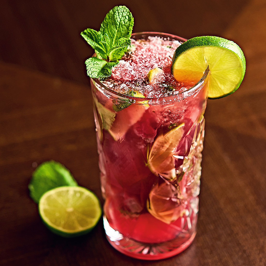 Gatavošana Glāzē liec šķēlīēs sagreiztu laimu, ieber cukuru un pievieno piparmētras.