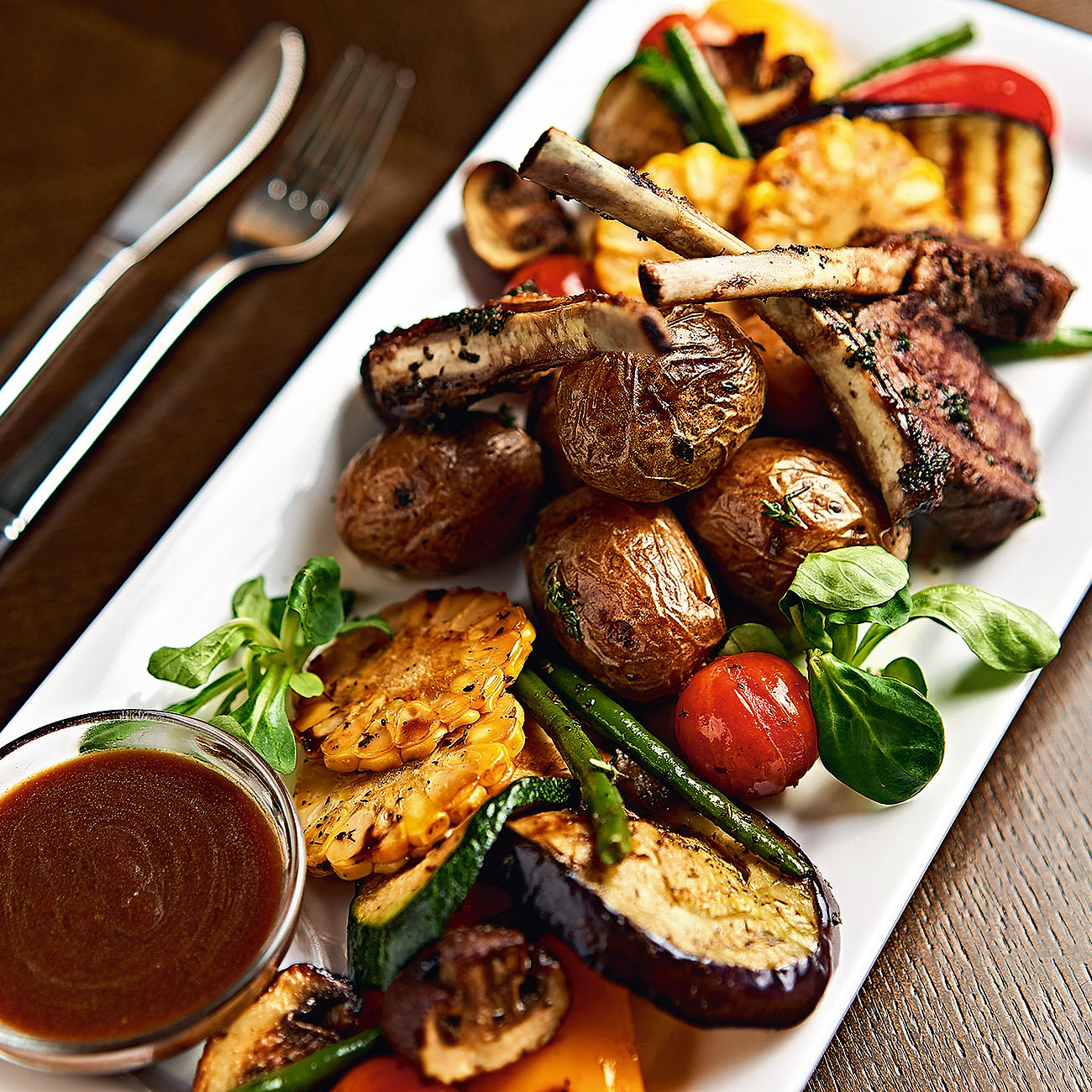 Pasniegšana Šķīvja viducī liec kartupeļus, apkārt - grilētos dārzeņus. Uz kartupeļiem liec jēra karē un pārlej ar piparmētru dresingu (mērce pastiprina garšu un noņem specifisko jēra gaļas aromātu). Klāt pasniedz glāzi sarkanvīna.
