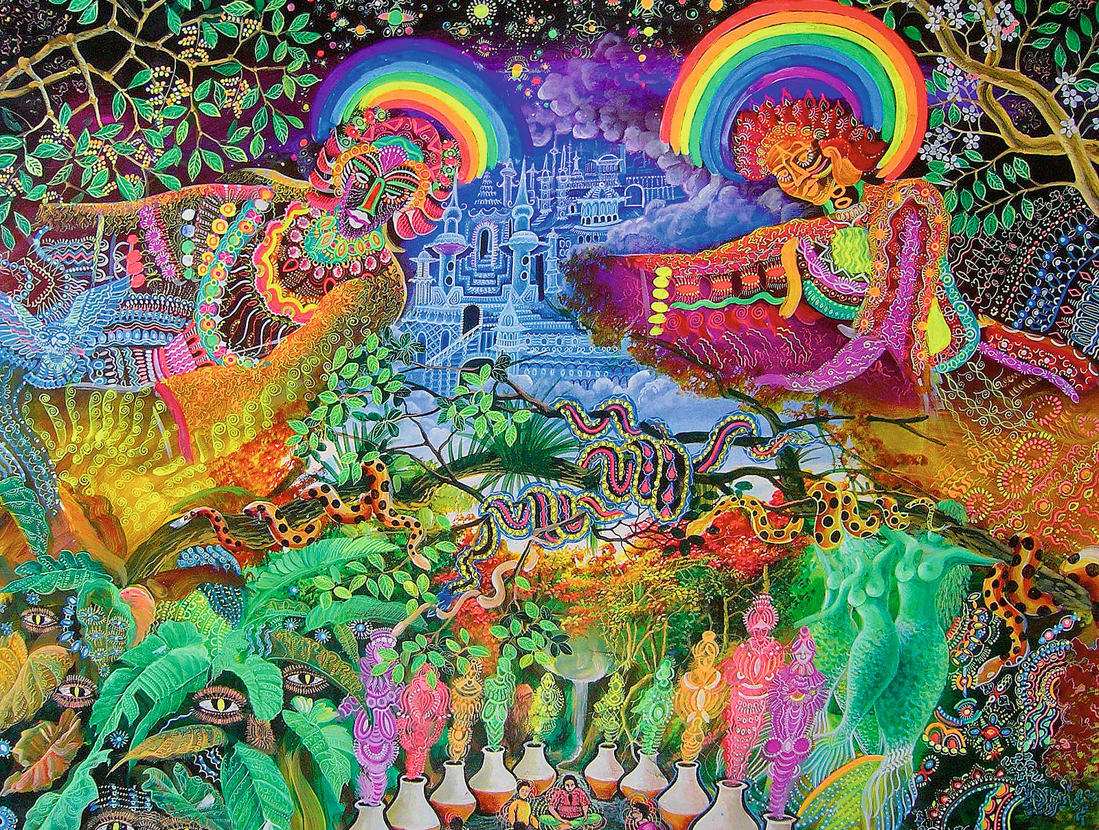 Mēs iedzērām ajavasku - jāteic, ka šis brūvējums ir reti pretīgs, - un apgūlāmies uz paklājiņiem. Es palūkojos apkārt - visi šķietami guļ. Sajutu vieglu durstīšanu lūpās. Aizvēru acis un ieraudzīju spilgtu krāsu paleti. Tās fantastiski pārklājās un pārgāja cita citā. Kā vēlāk paskaidroja Fredijs, manā priekšā bija parādījusies «mūsu Visuma struktūra». Struktūra man patika - viss bija ļoti pozitīvs, nekaitīgs, interesants. Es negulēju - jebkurā brīdī varēju piecelties, iedzert ūdeni, aiziet uz tualeti. Bet iekšējās vīzijas turpināja darboties.