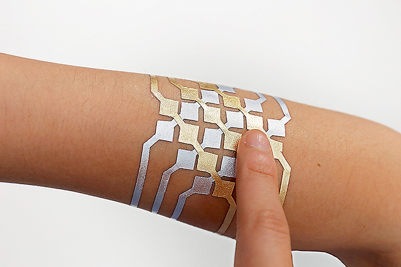Masačūsetsas Tehnoloģiju institūts un Mircrosoft pētniecības komanda ir radījusi metāliskus tetovējumus, kas var pildīt mijiedarbības funkcijas. Šo risinājumu sauc DuoSkin, un to var izmantot, piemēram, lai regulētu mūzikas skaļumu viedtelefonā. Par galveno tetovējuma mehānismu kalpo mikroshēma, kas veidota no elektrību vadošas zelta plēvītes. Kopā ar taustes sensoriem tā atrodas uz silikona papīra, kādu izmanto tetovējumiem. Dati no tetovējuma tiek nosūtīti uz viedtlefonu ar Near-Far Communication (NFC) palīdzību. Tāpat komandai ir izdevies radīt tetovējumu, kas maina krāsu atkarībā no ķermeņa temperatūras.