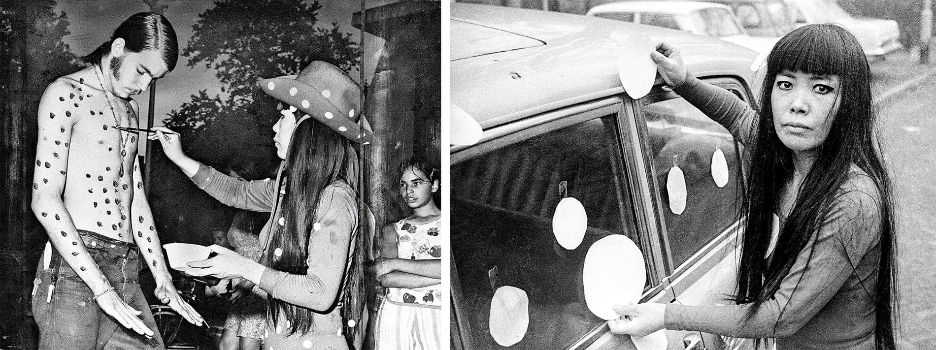 Runājot par kailumu kā performances objektu, Kusama bija viena no pirmajām, kas sāka rīkot hepeningus Ņujorkas ielās un savā studijā. Šie hepeningi gan bija hipiju deklarētās brīvās mīlestības iedvesmotas orģijas ar politiski vērstām akcijām pret karu Vjetnamā. Piemēram, reiz Kusama manifestēja vēstuli ASV prezidentam Ričardam Niksonam, piedāvājot “neaizmirstamu seksu”, ja vien viņš pārtrauks karadarbību. Bet atbildi nesaņēma… Hepeningu laikā Jajoi apgleznoja kailos ķermeņus, apkārtējos priekšmetus un sevi ar krāsainiem punktiem, lai “sasniegtu sava Es izskaušanu jeb saplūšanu ar Visumu”. Seksuālās revolūcijas apogejā Kusama sarīkoja provokatīvu hepeningu Homosexual Wedding (Homoseksuālās kāzas) baznīcā (1968), kā arī atvēra kailķermeņu apgleznošanas studiju un pat geju klubu KOK - Kusama Omophile Kompany. Tomēr vislielāko ievērību (lasi - skandālu) izpelnījās Kusamas inspirētais hepenings Grand Orgy to Awaken the Dead at the MoMA (Lielā miroņu atdzīvināšanas orģija, 1969) Modernās mākslas muzejā Ņujorkā, kur astoņi kaili modeļi iekāpa strūklaku baseinā un nostājās tēlniecības klasiķu Pikaso, Džakometi un Maijola skulptūru pozās.