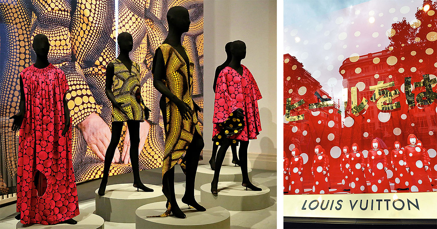 Papildus personīgā zīmola un arī modes preču veikala izveidei Kusama ir sadarbojusies ar vairākiem slaveniem modes brendiem- Issey Miyake, Marc Jacobs un citiem, kā arī ar Louis Vuitton, kuram izveidoja veikala skatlogu - sarkanbalti punktotu fantastisku vidi ar taustekļu ieskautu pašas mākslinieces vaska figūra centrā.