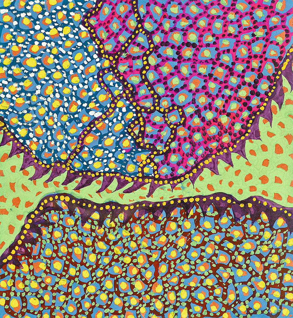 • Kopš bērnības māksliniece sadzīvo ar halucinācijām. Mākslas darbos tās parādās kā mazas cilpas, uzgleznotas uz vienkrāsaina fona, savītas vai punktētas. Punkts māksliniecei ir veids, kā koncentrēties, kā integrēt sevi, arī process, kuru viņa dēvē par pašiznīcināšanos.