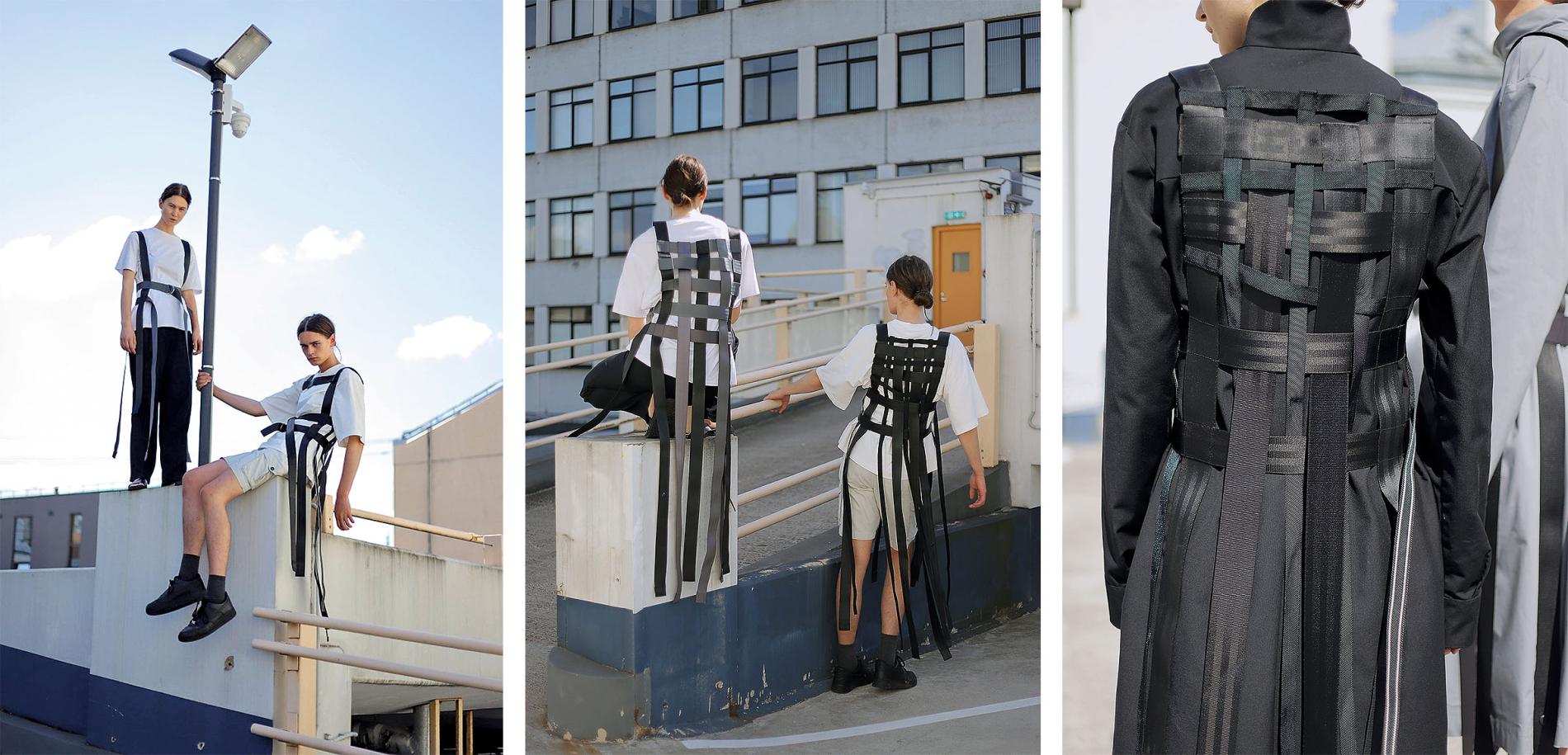 Arī stāsts par maniem trenčiem ir tāds - nestandarta. Izdomāju, ka varētu veidot trenču materiālu no vecām auto drošības jostām. Ar tēti braukājām pa šrotiņiem un meklējām, bet tad viņš uzgāja vecīti, onkulīti gados, kurš bija sakrājis automašīnu jostas ar nolūku tās izmantot bišu stropiem. Tā absolūti veiksmīgi, būtībā par brīvu, es tiku pie diviem maisiem jostu. Tieši jostās balstījās viss manas kolekcijas stāsts, jo tas ir otrreiz lietojams materiāls, un arī pielietojums ir iepriekš neredzēts.