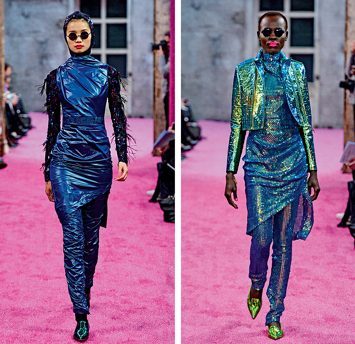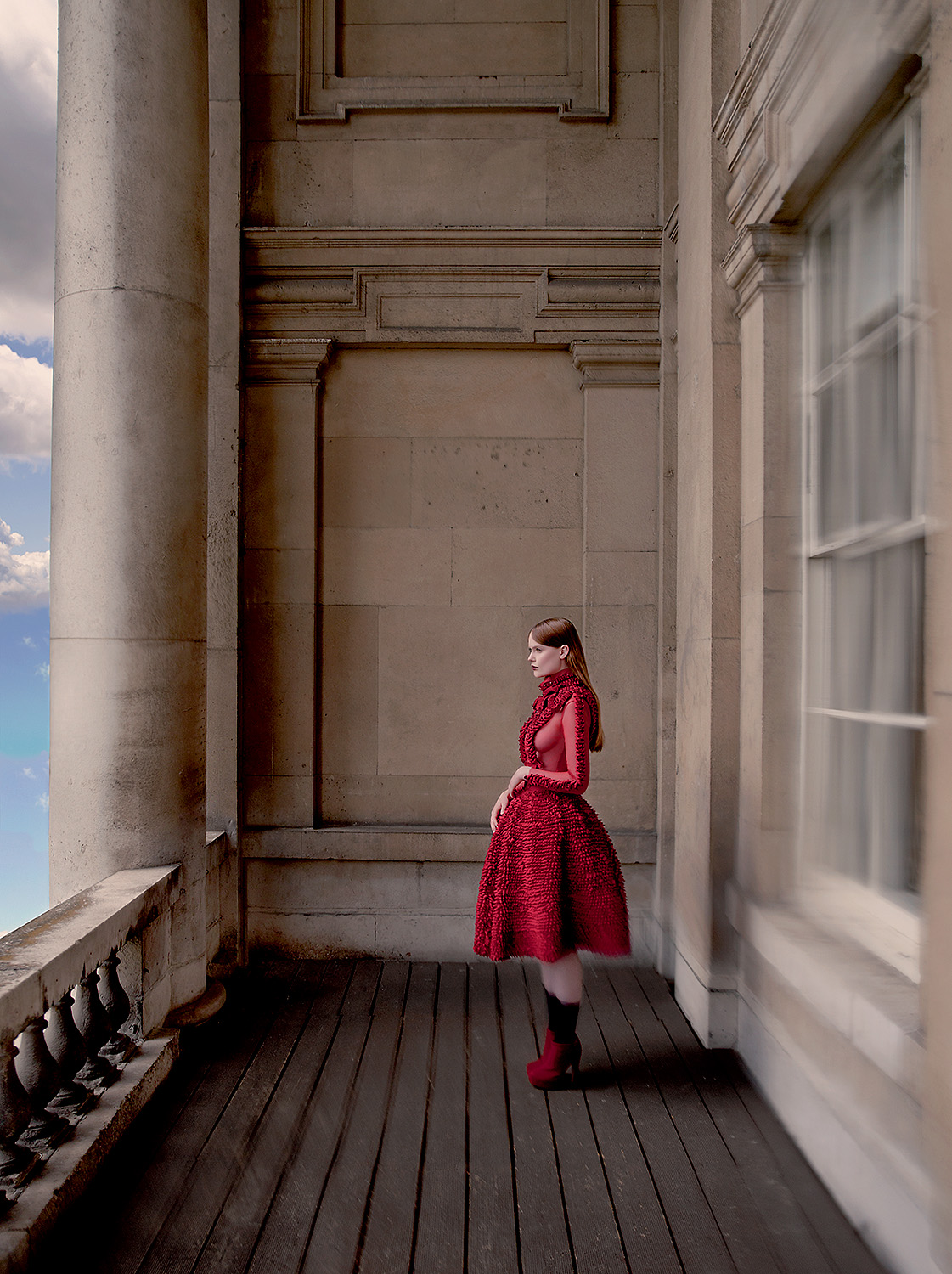 Bet šeit, lai gan arī notiek mijiedarbība, viss ir citādi - daudz laikmetīgāk. Scenogrāfiski, ar košiem, krāsainiem un daudzveidīgiem dizainiem. Man ļoti patika ideja par skulptūras kailo, ekspresīvo ķermeni un gaisā levitējošo kleitu. Tērpu košums ir gan saskaņā ar skulptūrām, gan pretestībā. Tā es izjūtu to sadursmes harmoniju, kas parādās izstādes nosaukumā. Tas parādās arī renesanses mākslas un laikmetīgo tērpu saspēlē.