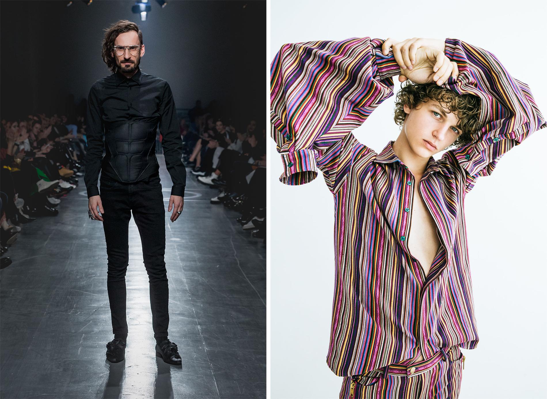 Arī vīrieša garderobē var būt izaicinošas lietas. Cits jautājums - ar ko to visu savelc kopā. Ja kreklu ar milzu daudzumu volānu vai mežģīnēm saliec ar raupja auduma biksēm un smagnējiem zābakiem, tas var izskatīties pat ļoti maskulīni.