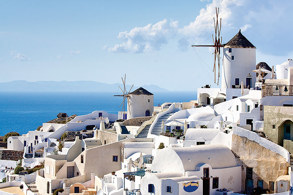 Ija, Santorīni, Grieķija Viena no pasaules romantiskākajām pilsētām vulkāniskā krātera malā. Sniegbalti namiņi kāpienu pa kāpienam no kalna virsotnes nolaižas līdz Egejas jūrai. Šāda arhitektūra izveidota, lai pasargātu namus zemestrīces gadījumā. Eksistē versija, ka baltās sienas ar ziliem jumtiem (Grieķijas karoga krāsās) ir kluss vietējo iedzīvotāju protests pret turku iekarotājiem, kas aizlieguši grieķu simboliku.