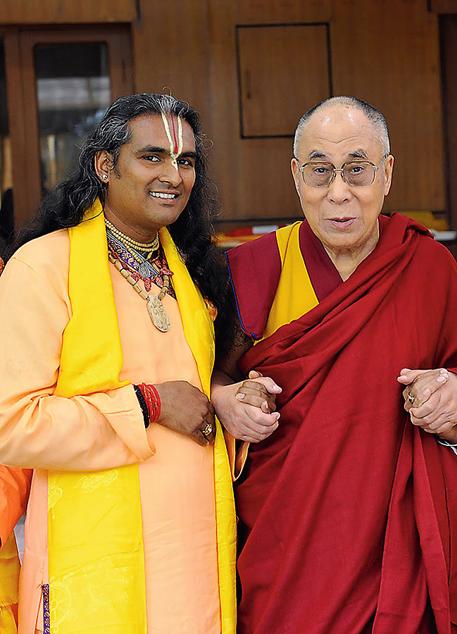Mūsu tikšanās notika svētdien vakarpusē. Es sēdēju ar planšeti ēdamzālē, ģērbusies legingos un svīterī, aplikusi ap pleciem šalli ar leoparda ādas rakstu, un dzēru tēju. Piepeši atskrēja plīvojošās oranžās drēbēs tērpies mūks no Rīgas, kurš bija atbildīgs par ordeņa darbību Latvijā, un vilka mani pie Višvanandas - viņam izrādījusies brīva stunda. «Kur ir garie svārki?» jautāja mūks, skatoties uz mani. «Kur ir vispār kaut kādi svārki?» Es aši apsēju ap vidu šalli. Skats, jāatzīst, bija visai vulgārs, gluži kā sveiciens no deviņdesmitajiem. Bet nu labi, vismaz kājas nebija redzamas.