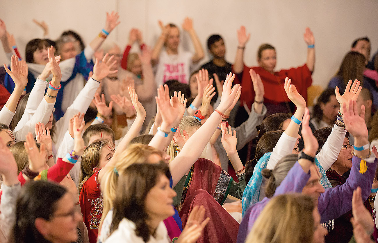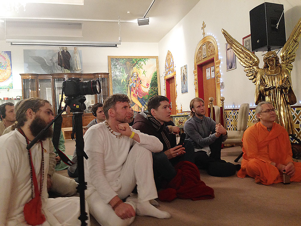Lielā zālē uz zemē saliktiem spilveniem un gar sienām novietotiem krēsliem iekārtojušies ap divi simti cilvēku. Daudzi ir greznos indiešu tērpos. Mūsu grupas vadītājs zaļā kaftānā vairs neatgādināja teroristu, bet gan cēlu maharadžu no bērnībā redzētām indiešu filmām. Es apsēdos iepretī paaugstinājumam, ko rotāja Višvanandas tronis. Gaisotne bija kolorīta - kaut kas vidējs starp folkmūzikas koncertu, pikniku un Jaungada bērnu rītu. Skanēja indiešu mūzika, skatuve pārklāta ar zilu samtu un izrotāta ar gigantiskām mirdzošām sniegpārslām, ziediem, spīguļiem un lukturīšu virtenēm. Bērni skraidīja pa paklājiem, kāds kaut ko grauza, gremoja un dzēra no termosa.